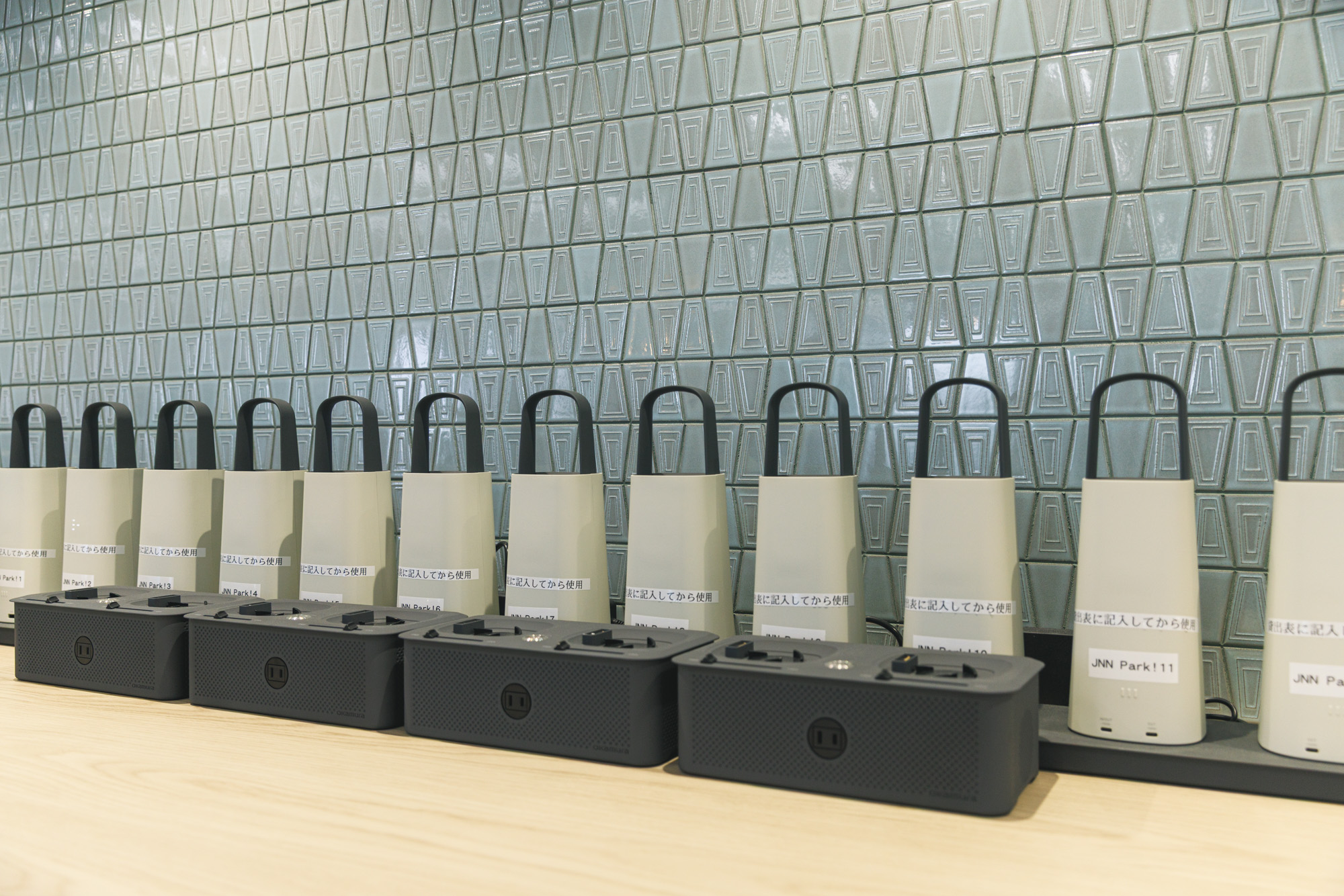 このボックス席ではPC作業をする人も多いです。囲まれている感じが落ち着くんでしょうね。共用スペースにはポータブルバッテリーを常備しているので、長時間の作業でも安心です。配線が見えると空間の美しさが損なわれるので、ポータブル式にして正解でした。