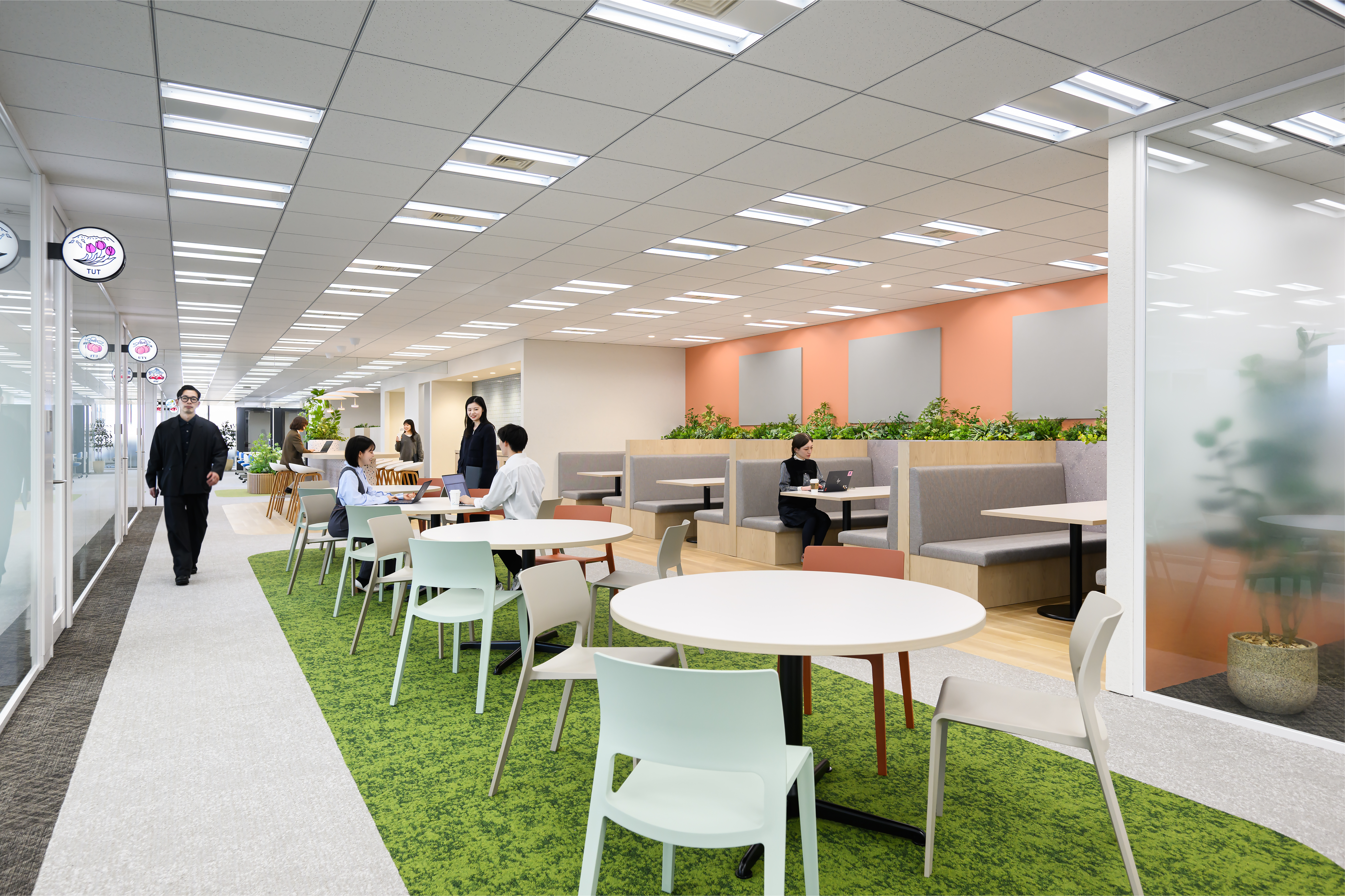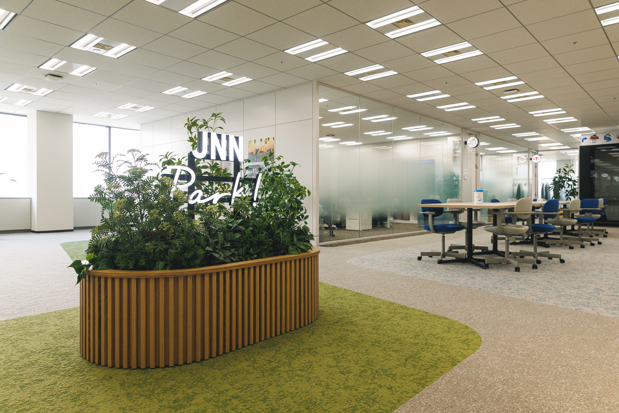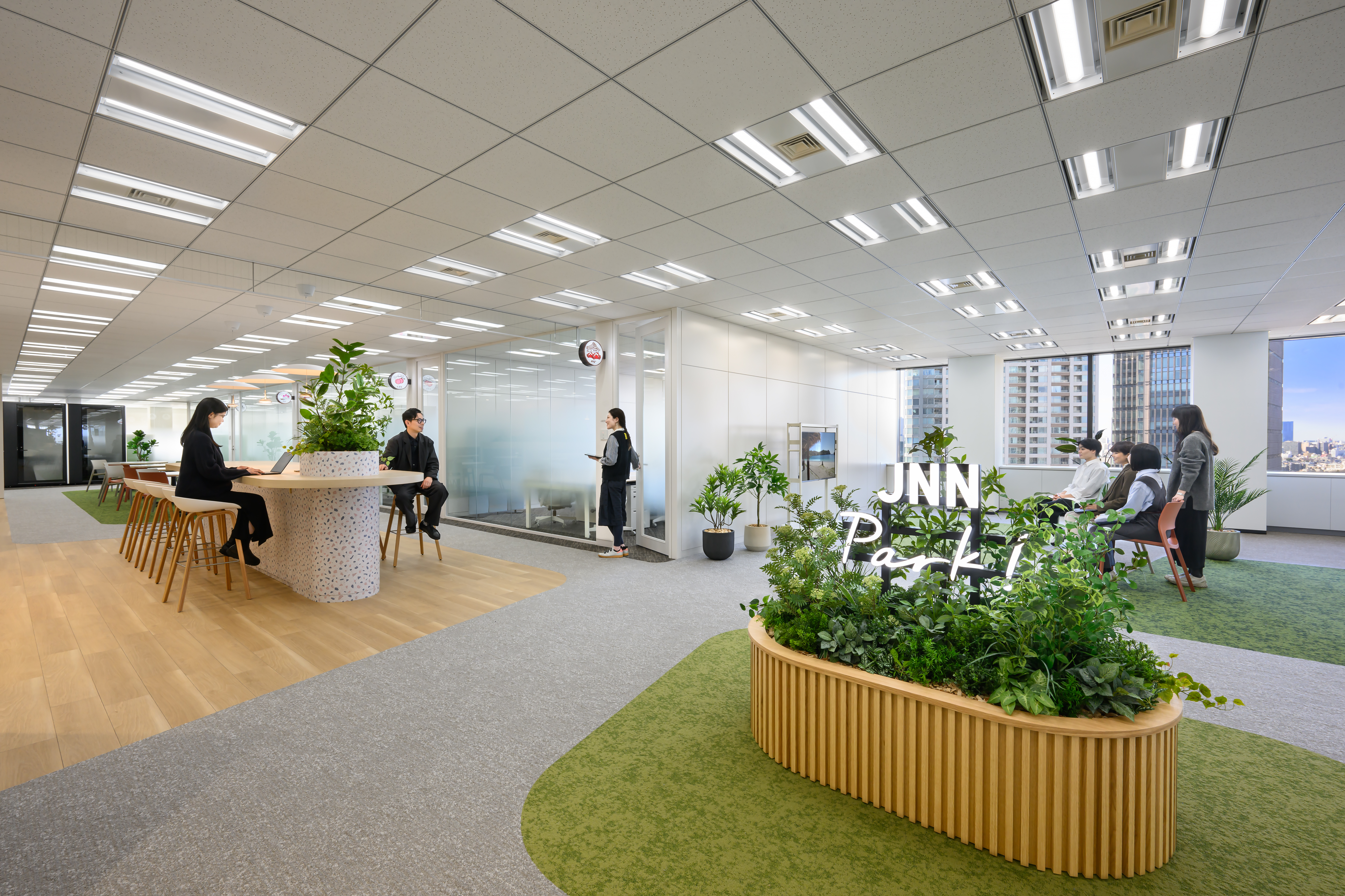 共用スペースは「JNN Park!」の名前からイメージを膨らませ、公園のように開かれた明るい雰囲気を目指しました。みなさんが気軽に集える場となってうれしいです。