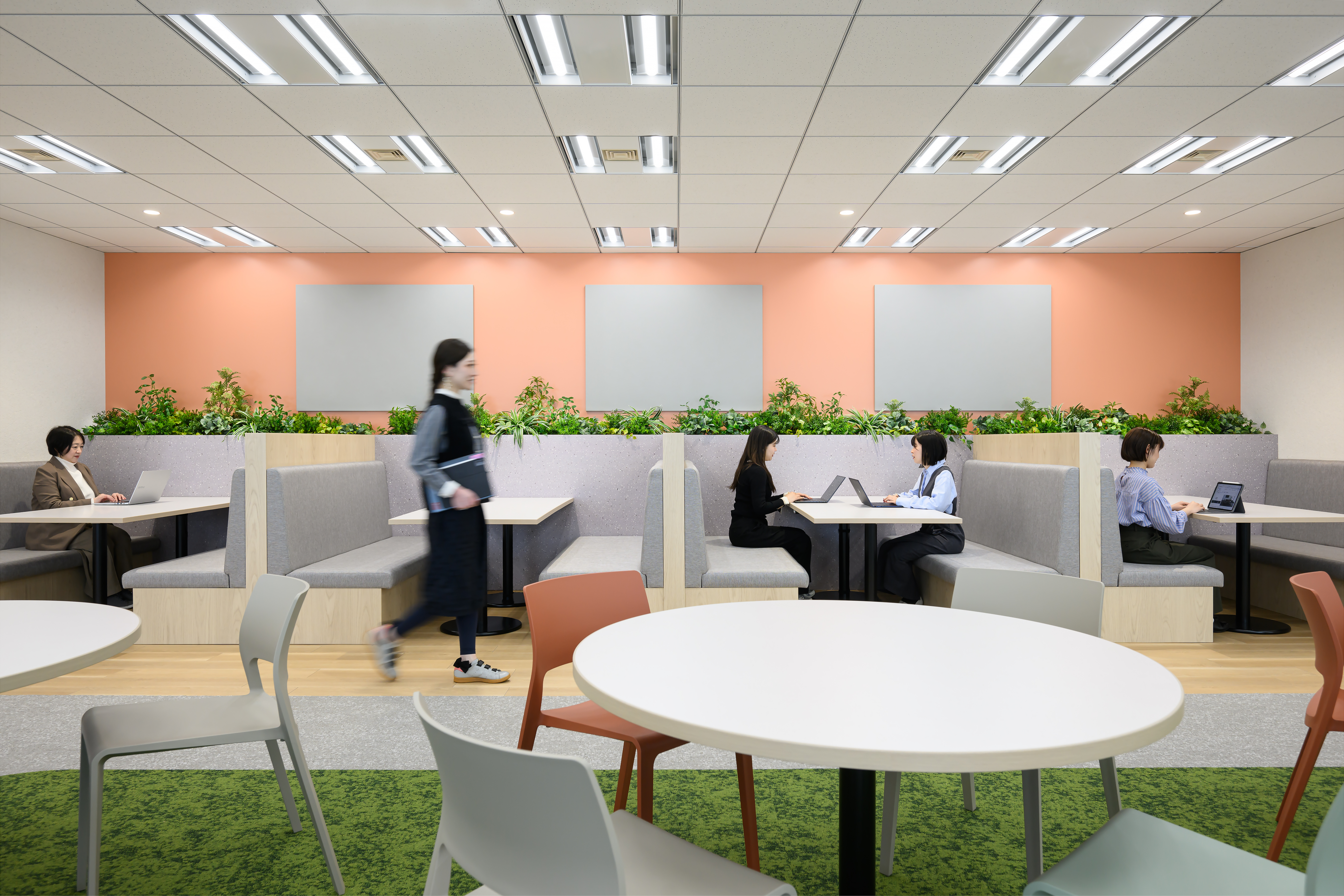 ランチやPC作業、クライアントとのミーティングなど、さまざまなシーンに対応するテーブル席&ボックス席 写真:Kudo Original Photo
