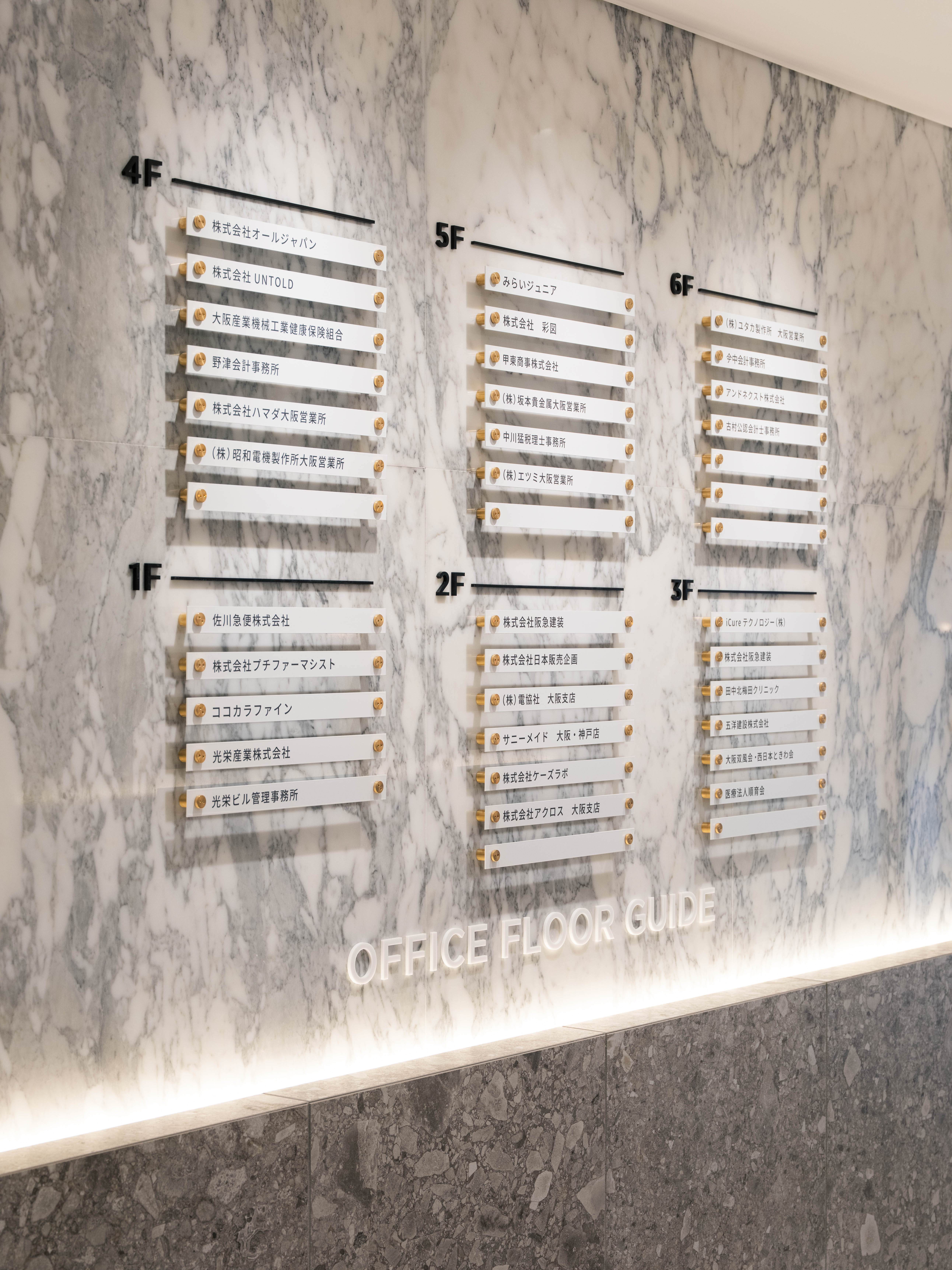 元々は、エントランスの左側壁面はすべて大理石でできていたのですが、デザイン上、全部は使わないことになり、余った大理石を何か活用できないかと考えたんです。歴史の継承に加え、フロアマップに用いることでテナント様同士の名前が並び、自然な“横の繋がり”も感じられるのではないかと考えました。