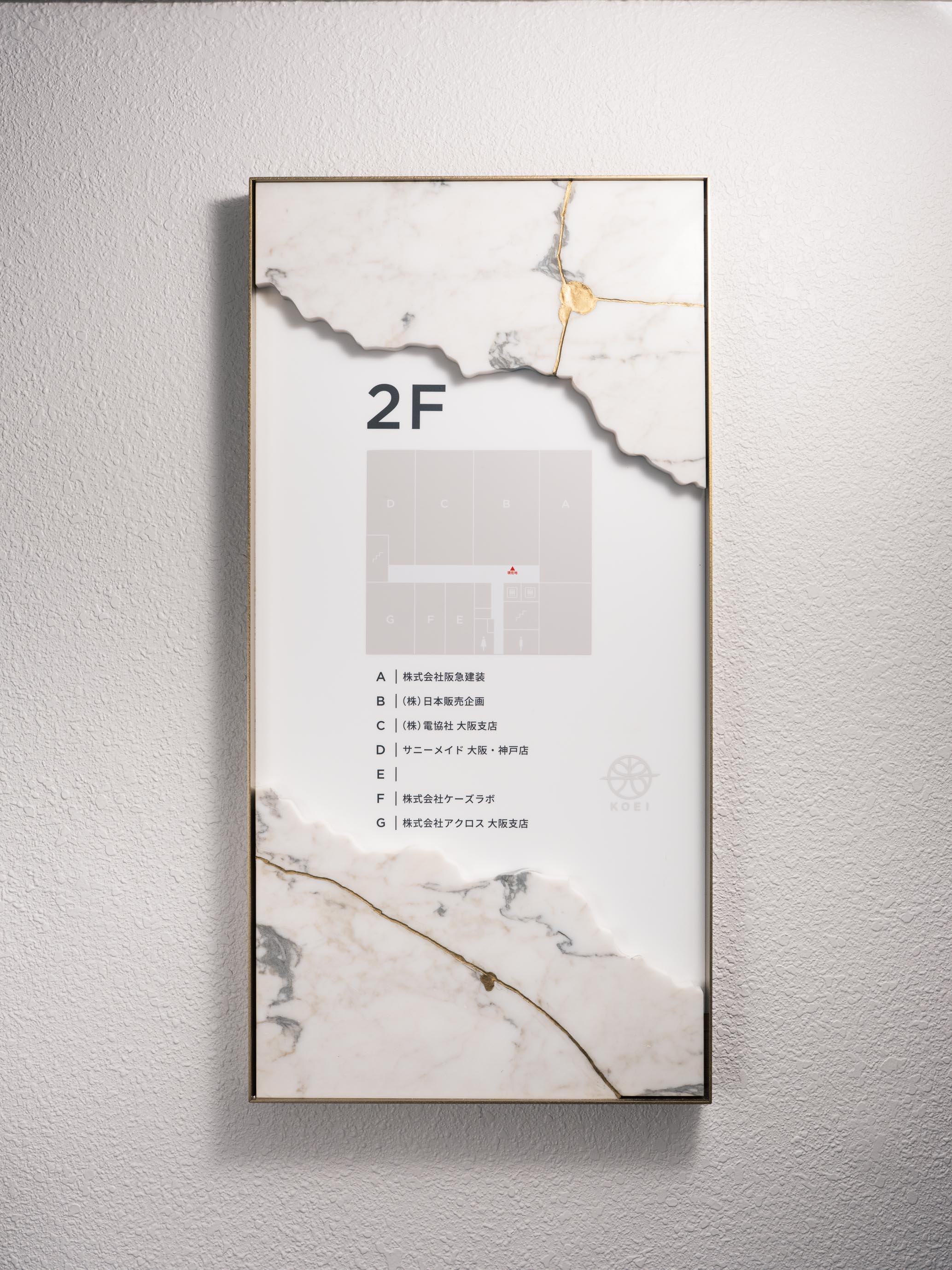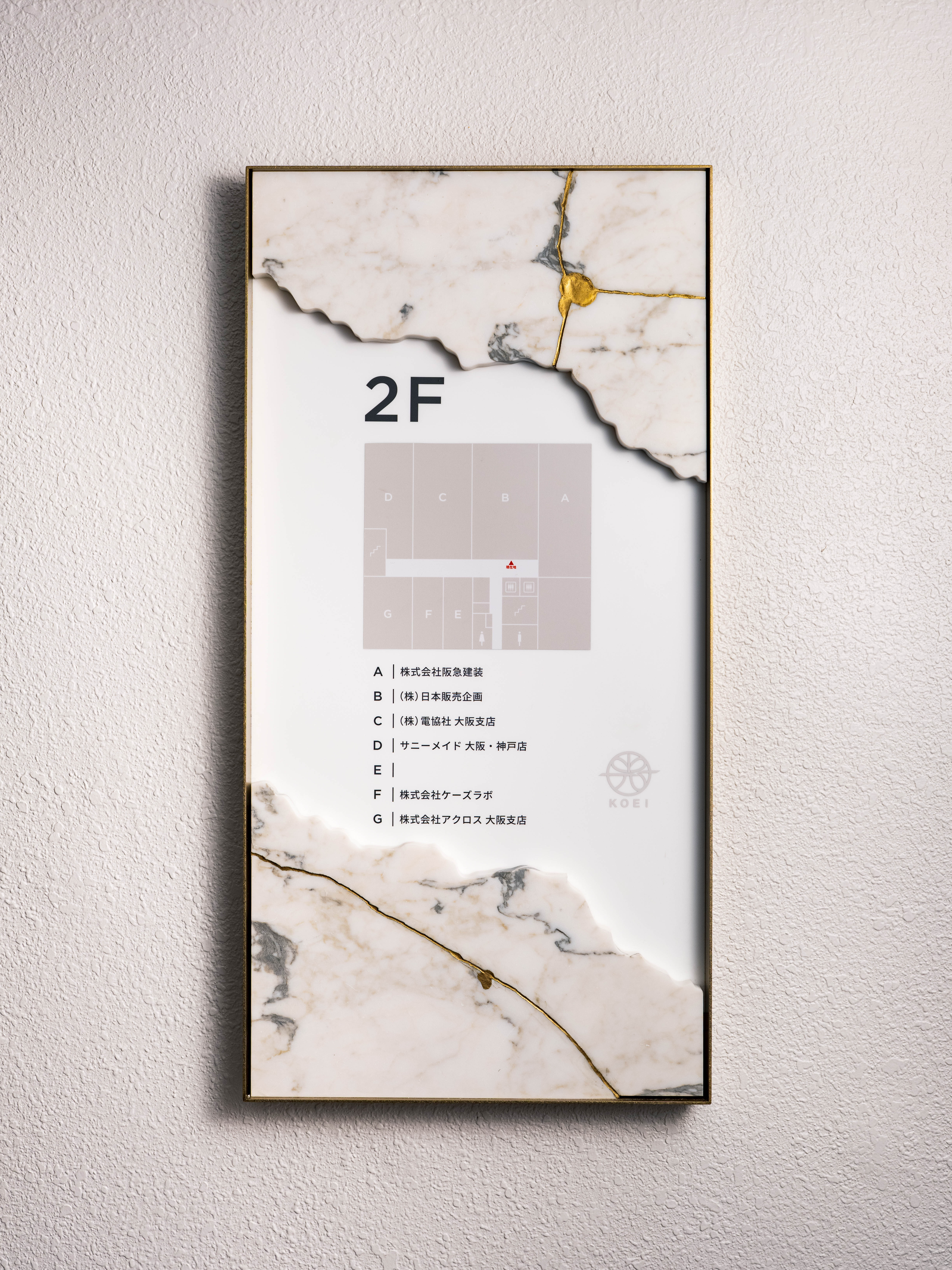 各フロアのフロアマップに使われている大理石は、改修前のエントランスで使われていたもの。金継ぎをして生まれ変わった 写真:NISHIOKA KIYOSHI