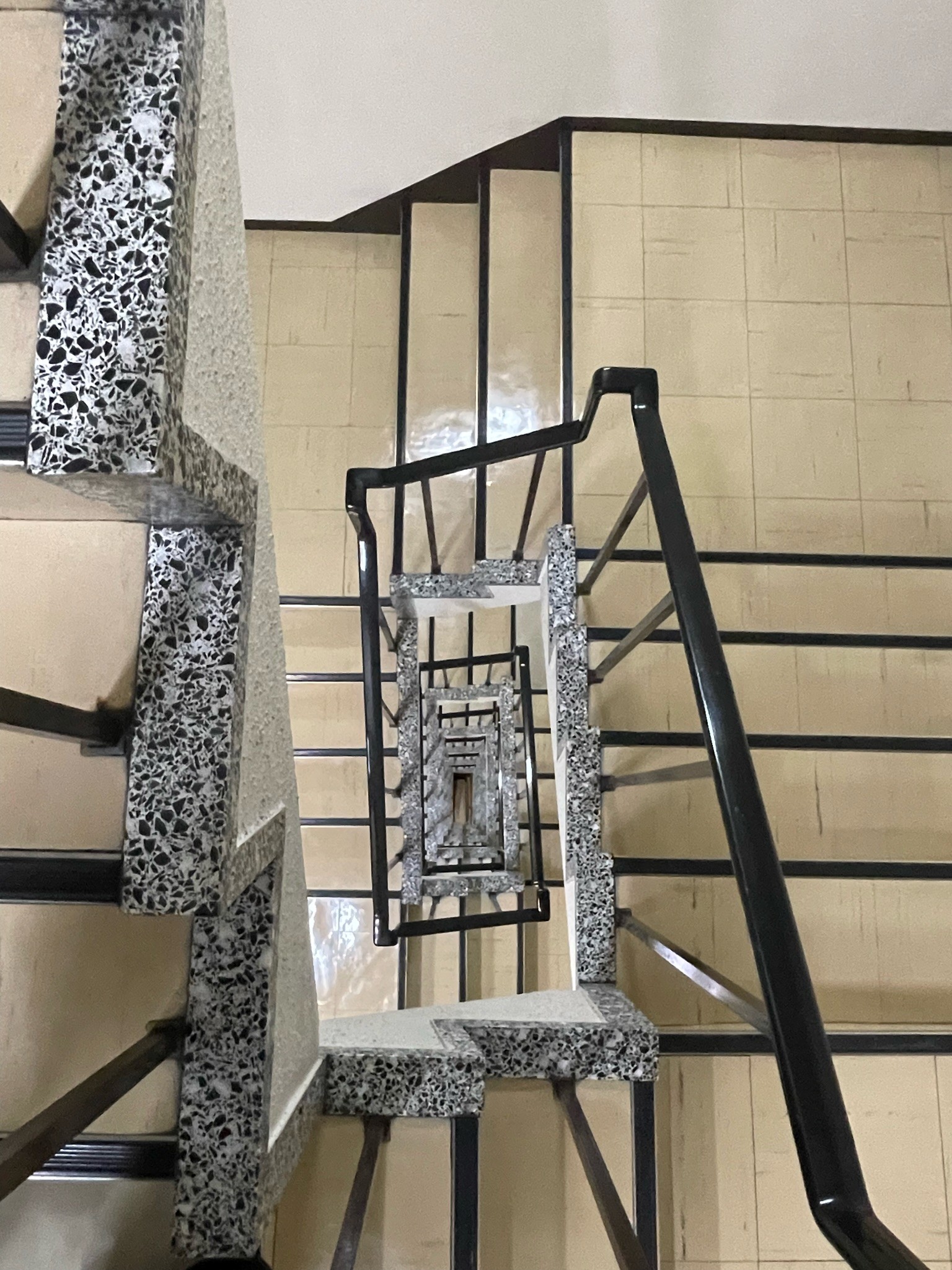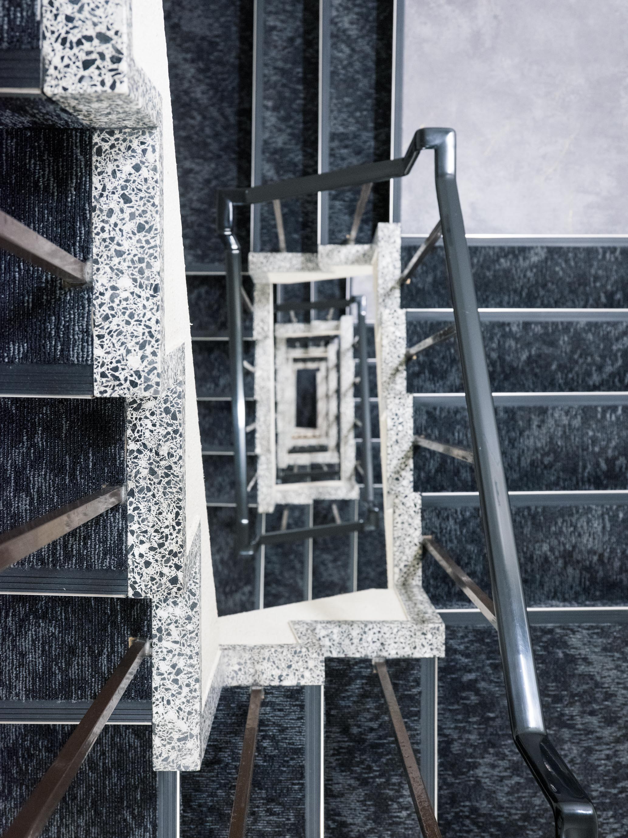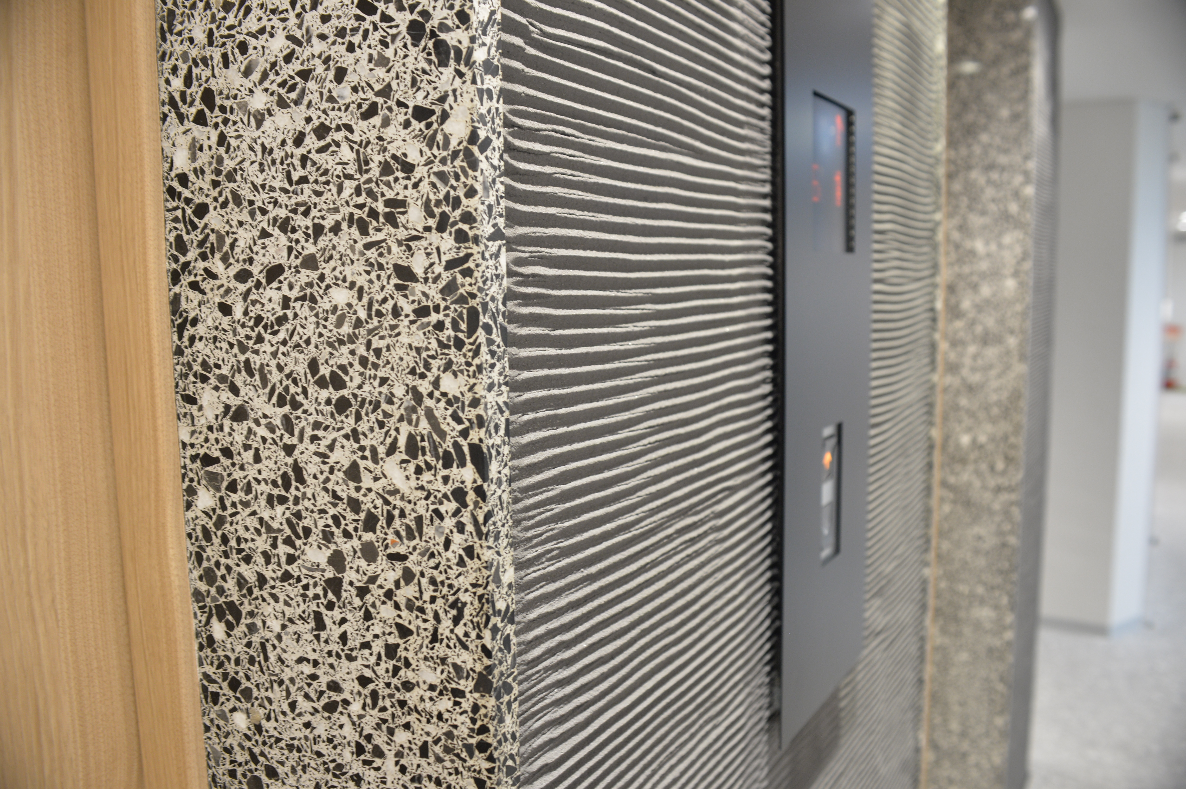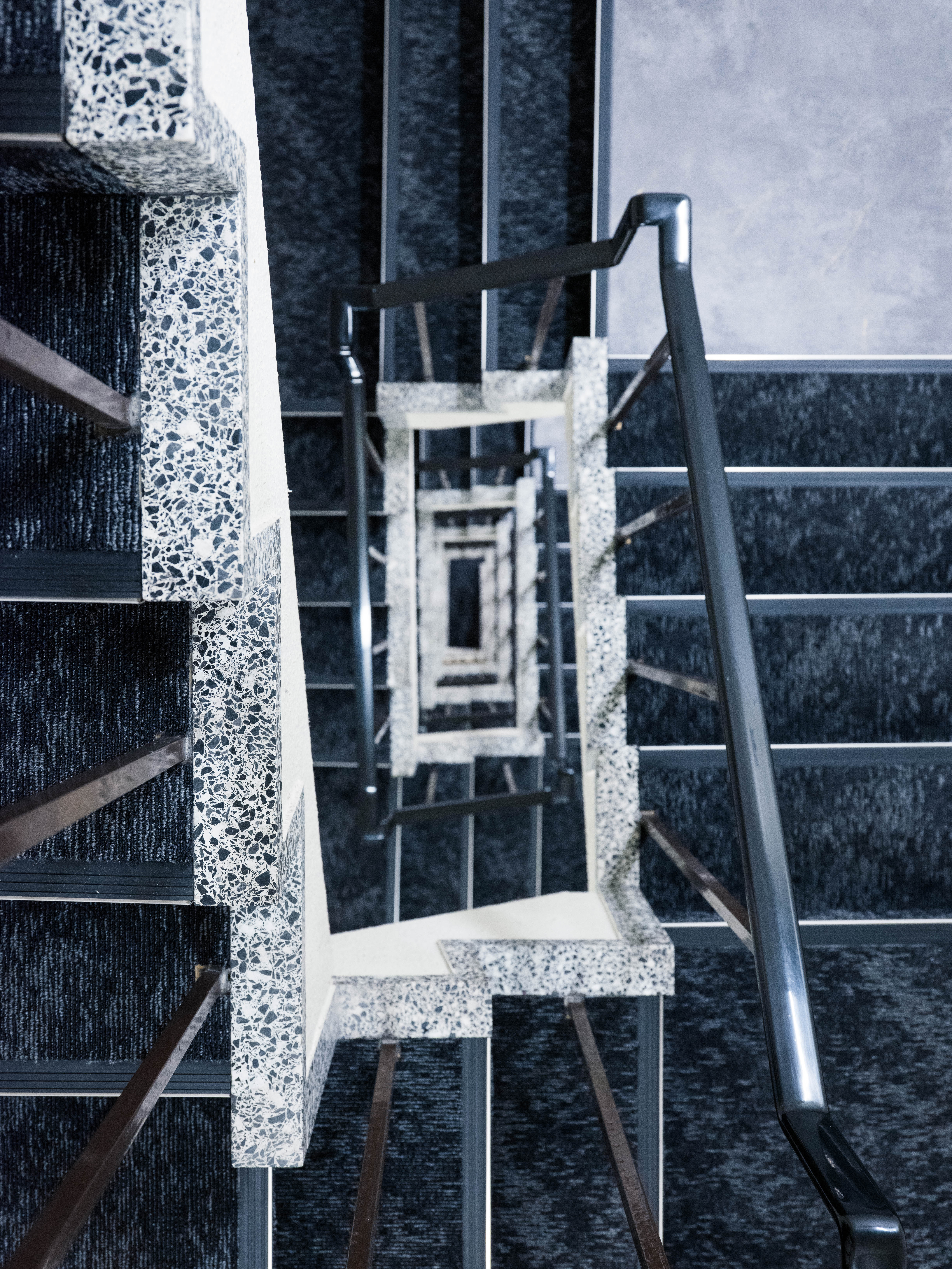 既存のものを活かすという観点では、エレベーターの枠や内階段に使われていたテラゾーも、当時のまま残しています。テラゾーとは大理石や石灰石などを砕いてセメントや樹脂などで固めた後、綺麗に磨きあげてつくる素材で、改修で無くしてしまうより、残してアートとして昇華させた方が良いのではないかと思い、このデザインを提案しました。