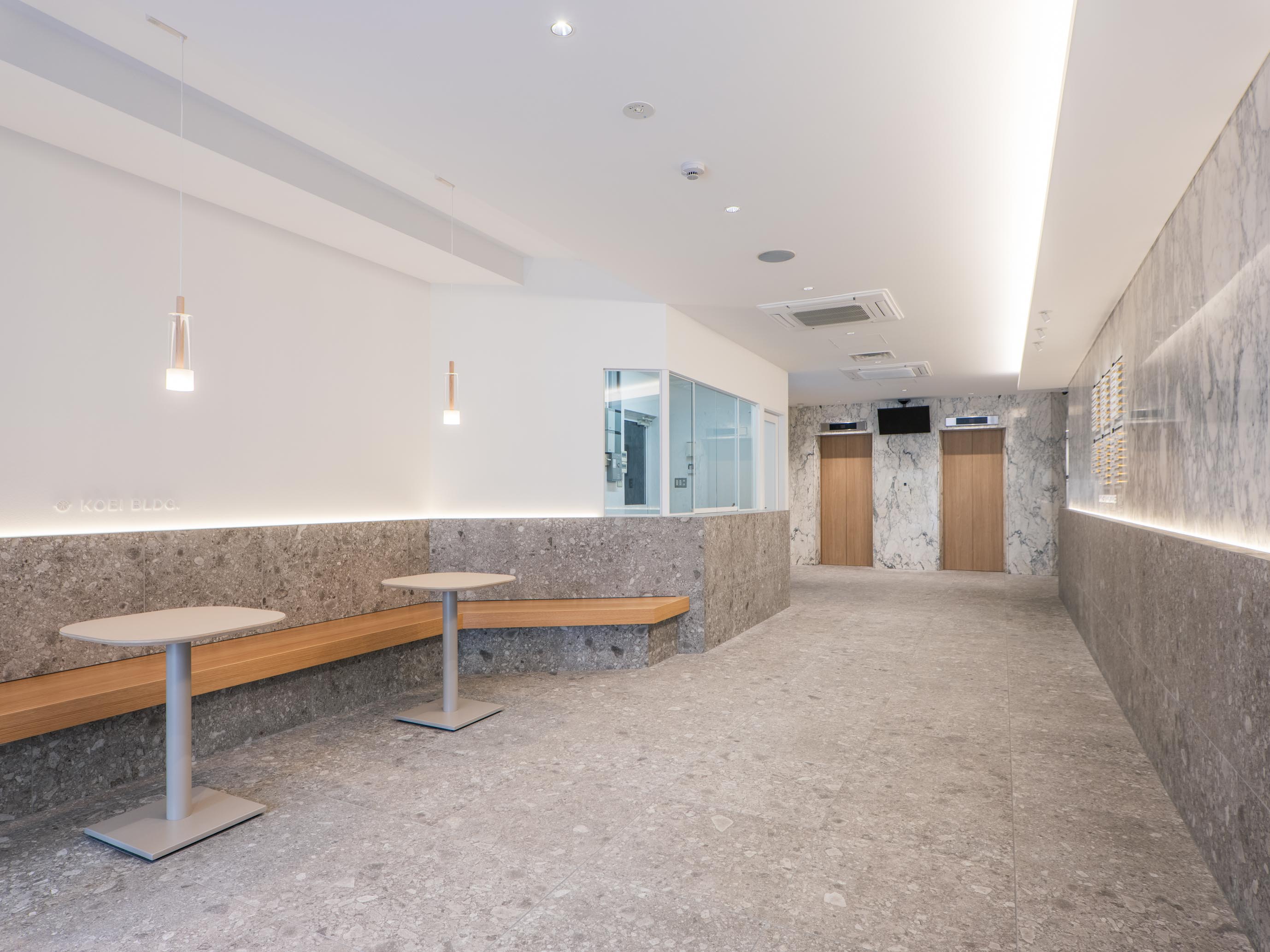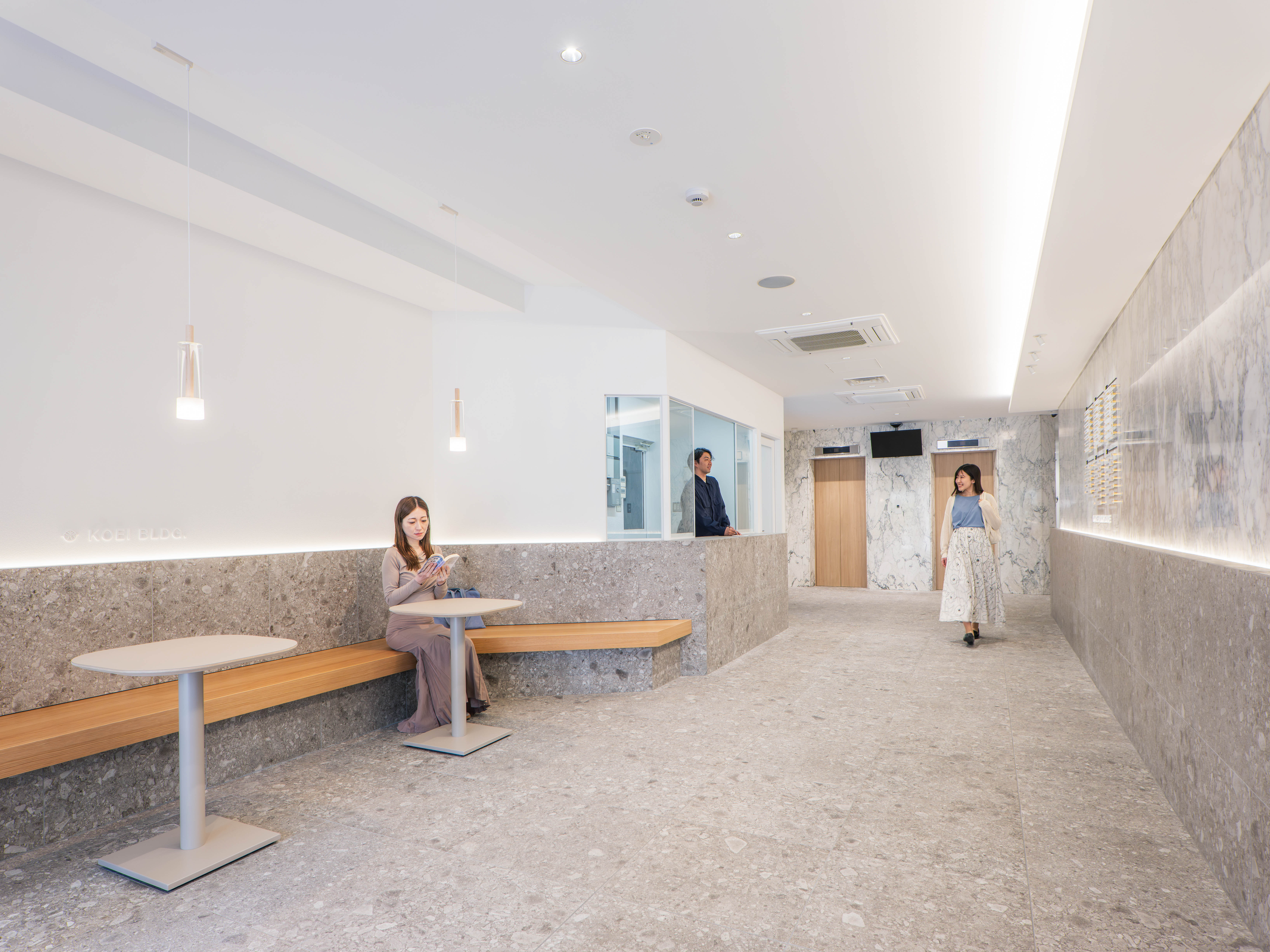待合スペースはコミュニケーションの場のひとつと考えたのですが、そこにたどり着いたのは改修前の光栄ビルが関係しているんですよ。今ではめずらしい有人の受付がエントランスにあって、その受付の方がさながらハイタッチするような勢いでテナント様と明るく挨拶している様子を見て、「人と人の繋がりや温かみのあるビルだな、このことをリノベーションコンセプトの軸に据えられないかな」と考えたわけです。
