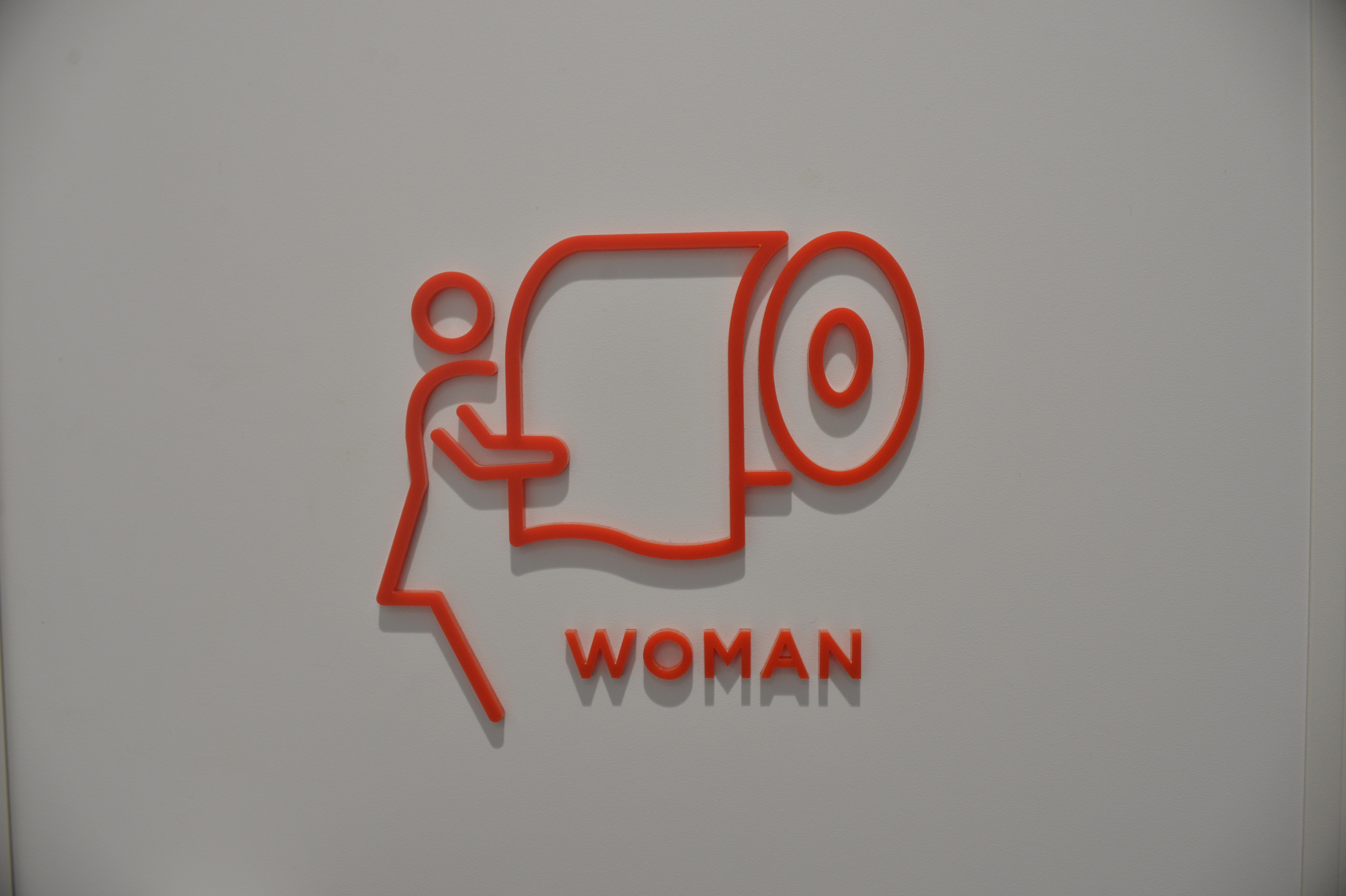 光栄ビルのトイレのピクトサイン。岩本様が過去に見て気に入っていた「ひょっこり顔をのぞかせる」イラストの構図を取り入れた 写真:GOOD PLACE