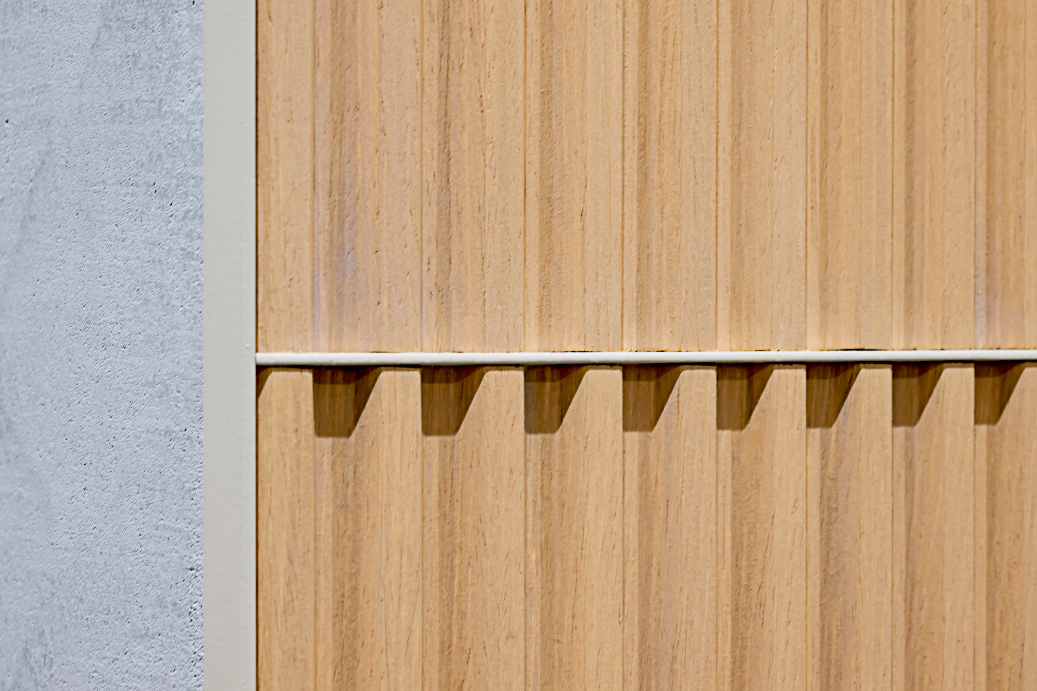 素材使いでは、本社オフィスのナチュラル&シックなデザインを踏襲しながらも、オークを中心とした素材を取り入れることで温かく柔らかな印象を持たせ、コンセプトを表現。リブ材や左官材・カラーガラスといったマテリアルによって質感にバリエーションを持たせることで、エリアごとに変化を持たせている。