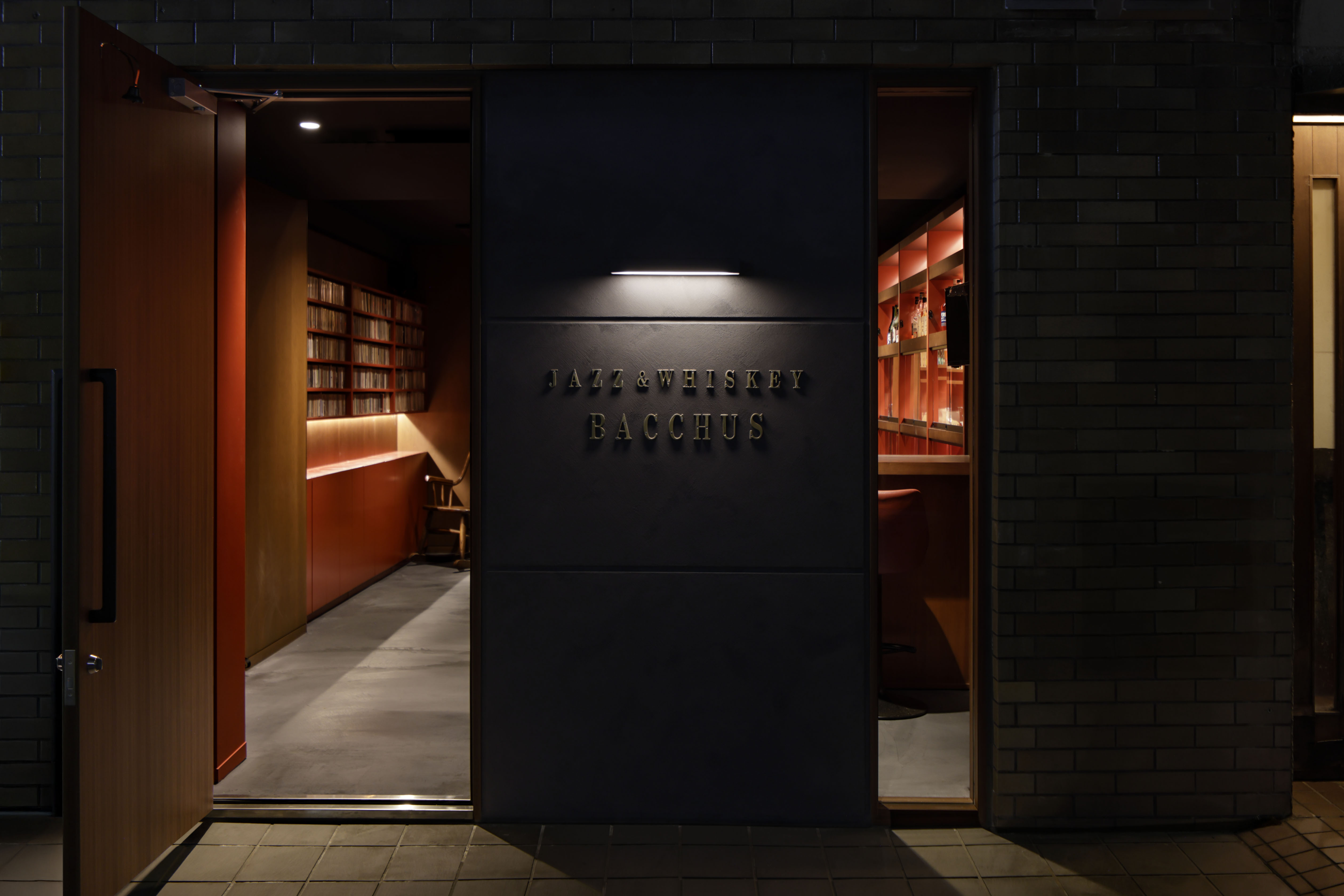 木目調のドアとダークな左官壁で、ゆっくりと音楽を愉しむ大人の場であることを表現。