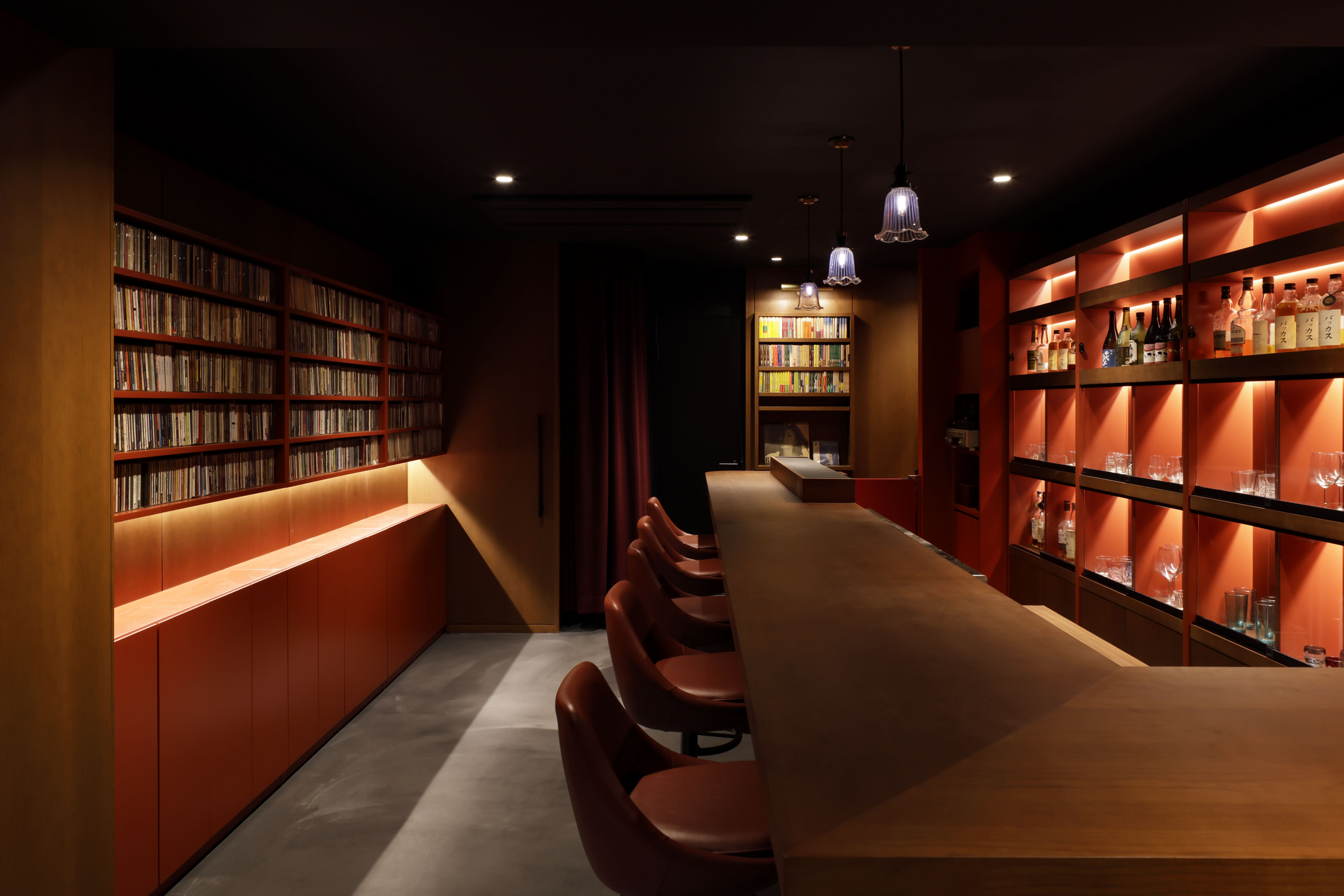 赤色を基調に赤みのある木目調を合わせた。そこへ思い切って光量を絞った照明を合わせ、温かみのある落ち着いた空間を演出。荒く仕上げた床面やバックヤードを仕切るカーテンが、タイムレスなエンターテインメイント空間の演出に加えて吸音効果の役割も果たす。