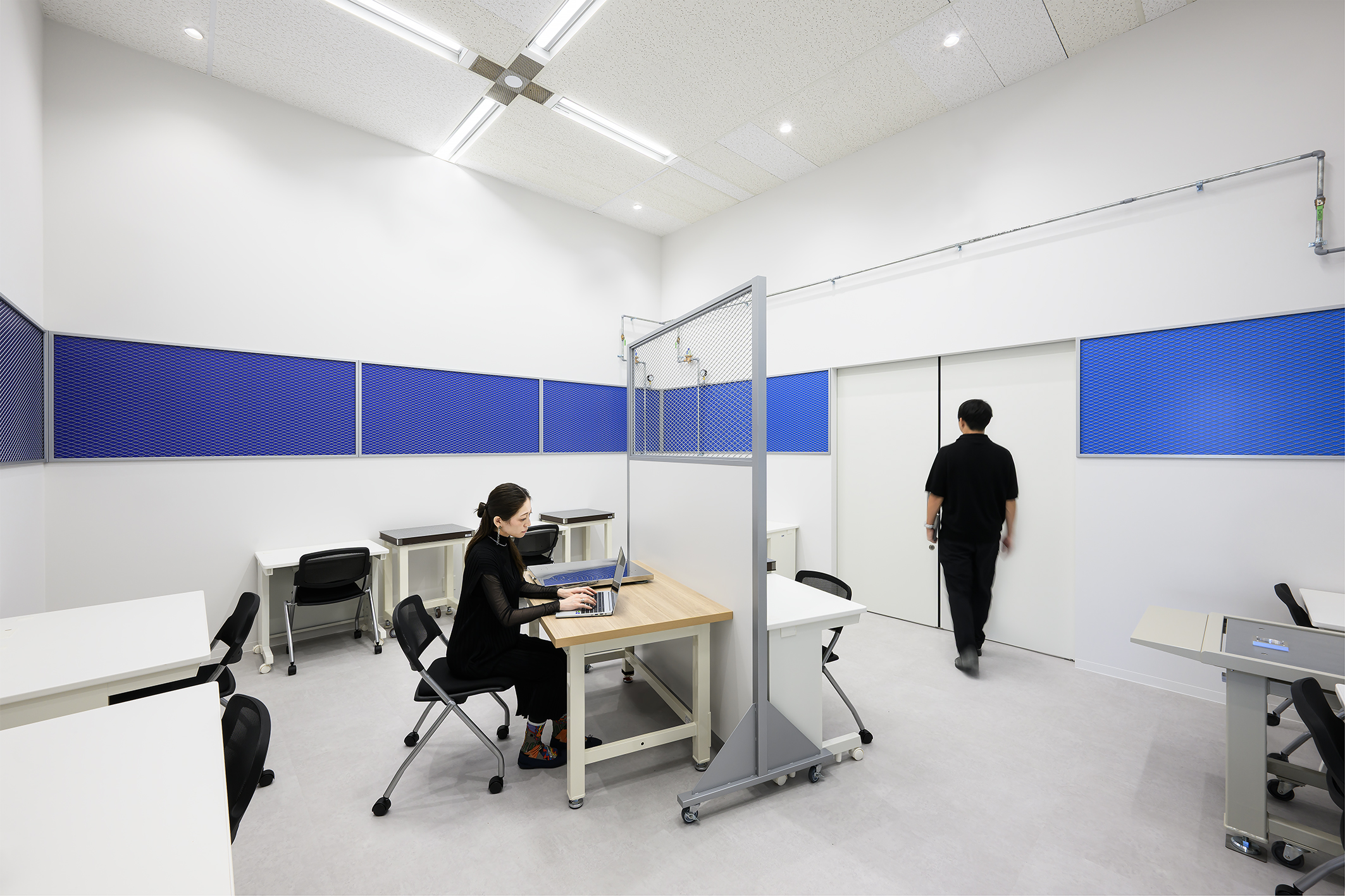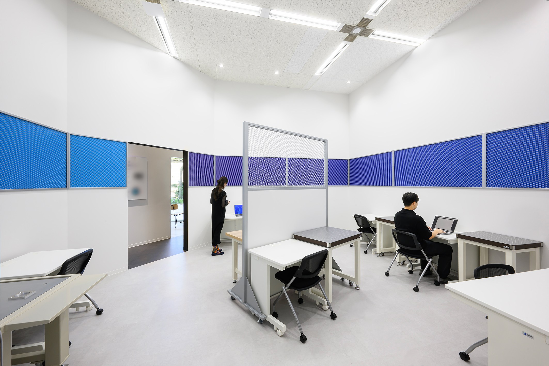 デモンストレーションエリアは明るく開放的な空間となっており、様々な製品の稼働の様子を目で見て体験することができる。また、コンセプトを表現するための素材として角度によって見え方が変化するエキスパンドメタルを壁面に取り入れた。