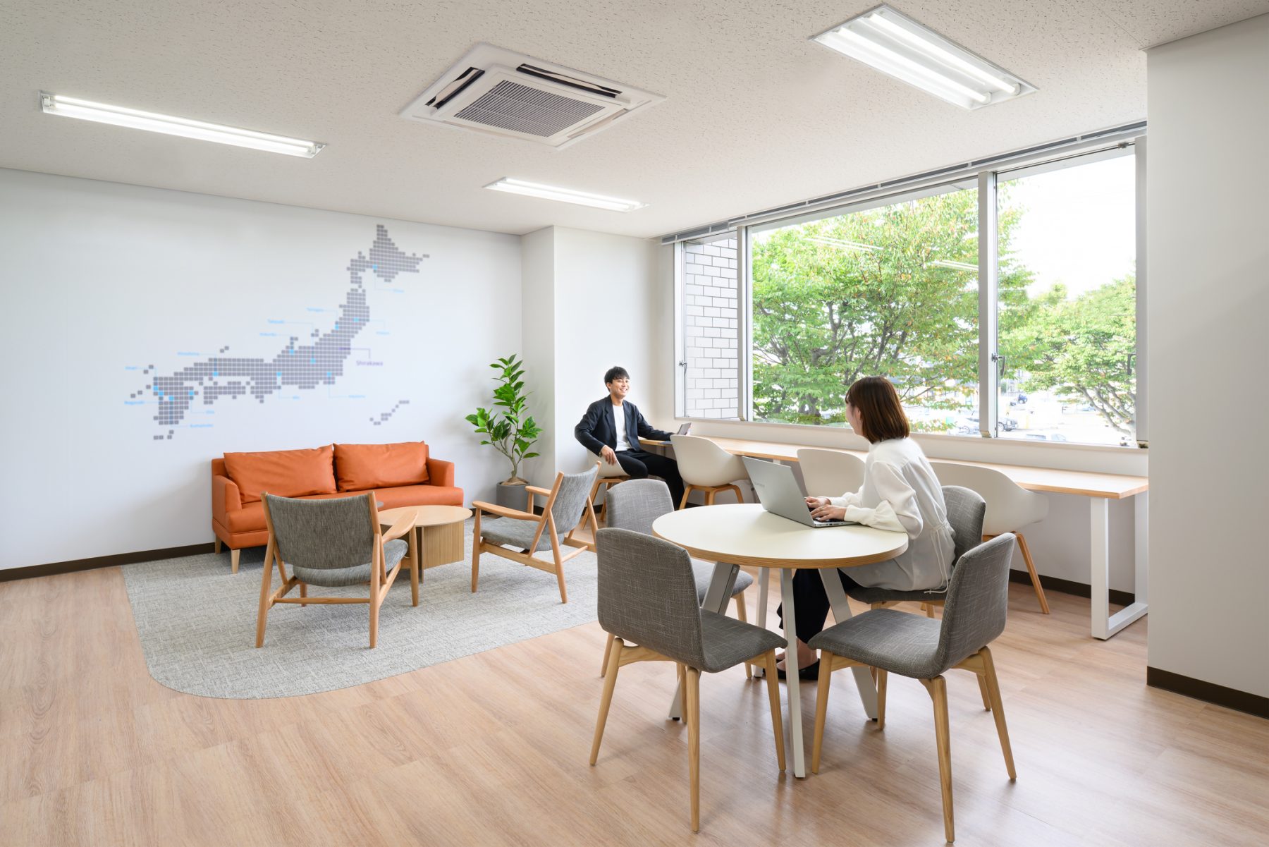 2階は1階と異なり、ほっとひと息つけるリフレッシュエリアとして設置。ゆったりとくつろげるソファやラウンジチェアなどを配置し、窓からの景色を眺めながら落ち着いて休憩できる場所にした。 - プロジェクト