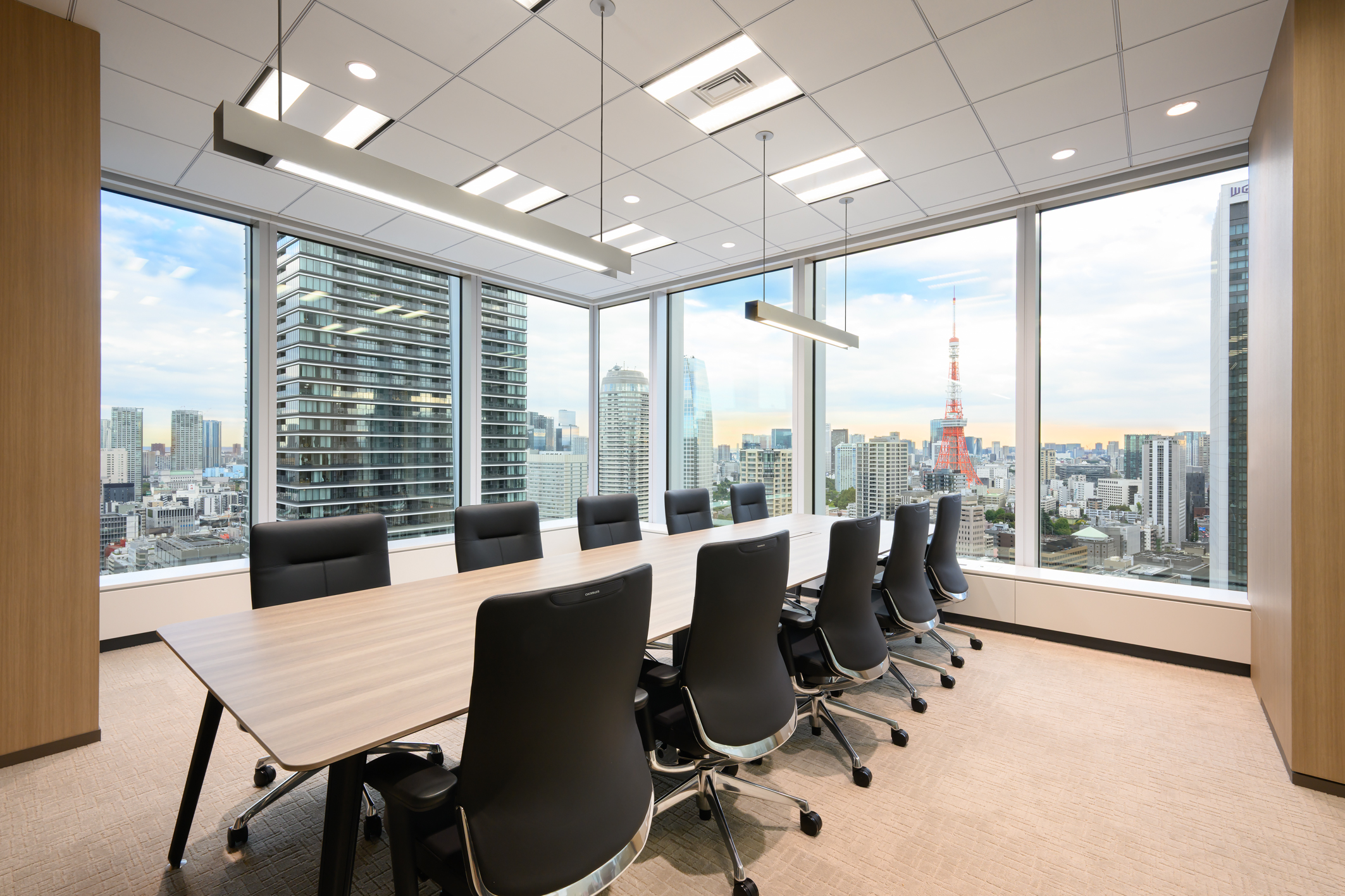 入居ビルの立地の景色を活かした洗練感・開放感・高級感のある来客エリアの構築と、コミュニケーションを促進する空間づくりをご要望いただいた。 - コンセプト
