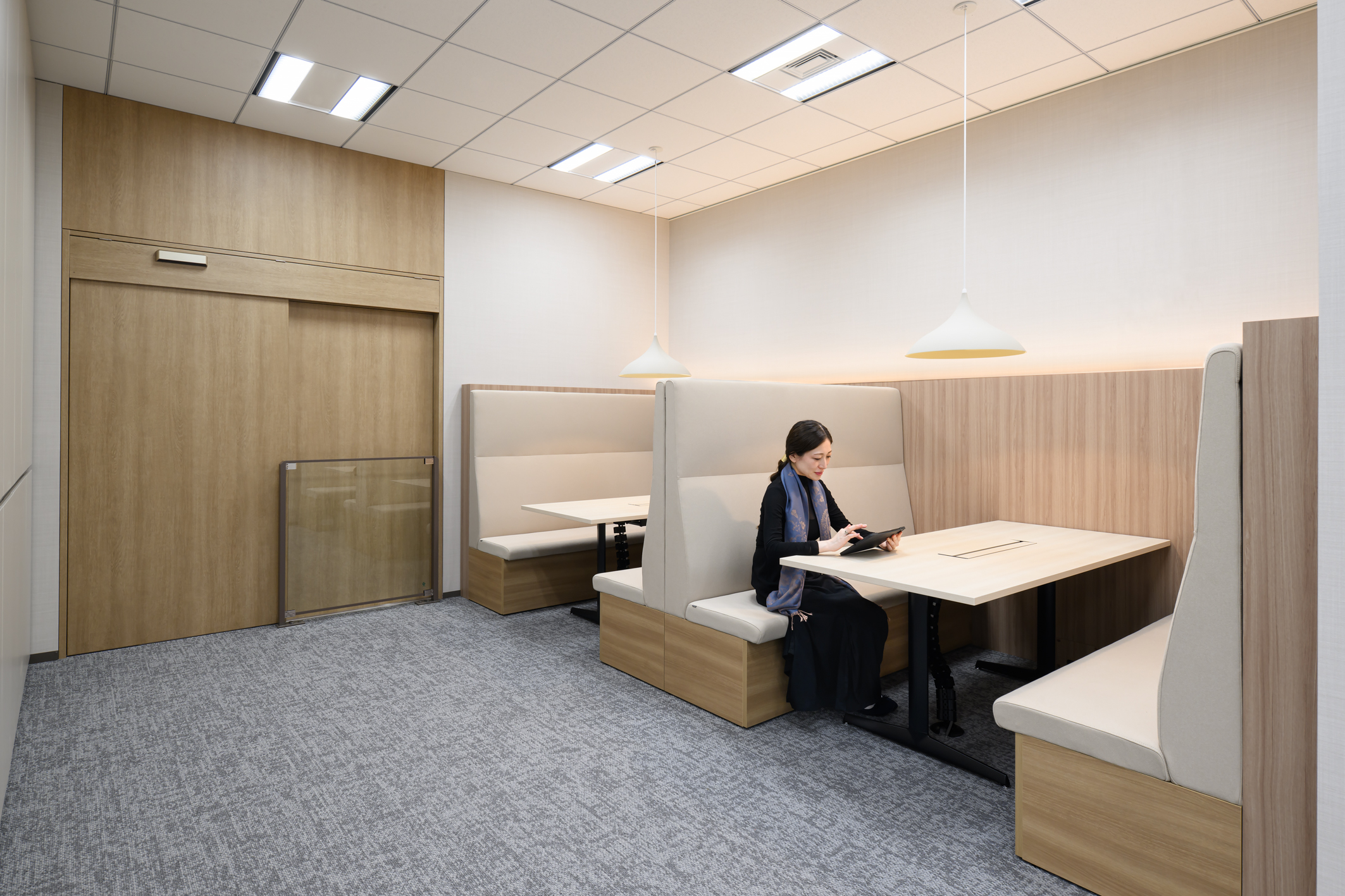 オープンな打ち合わせやブレインストーミングに最適なボックス席のブースは会話が活発になると想定されたため、ハイバックベンチを採用し音に配慮。