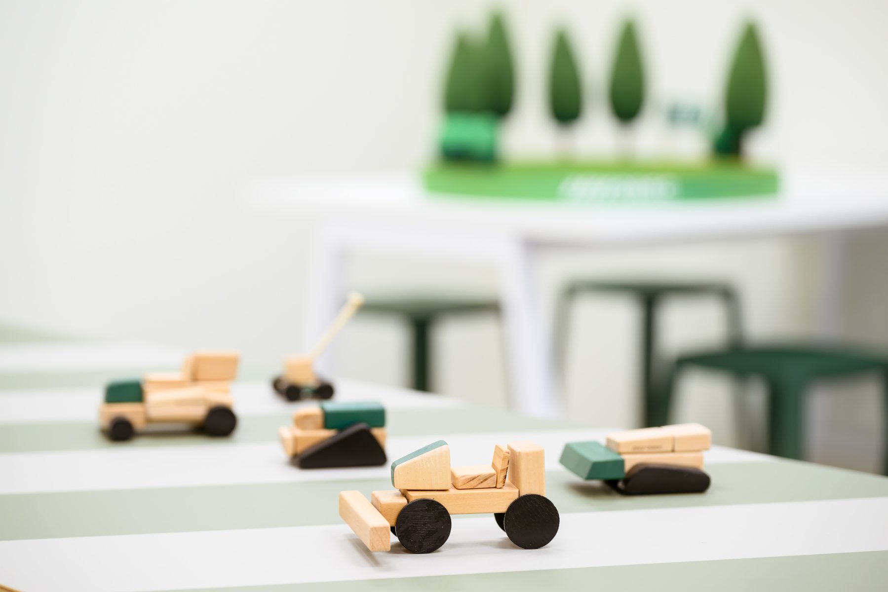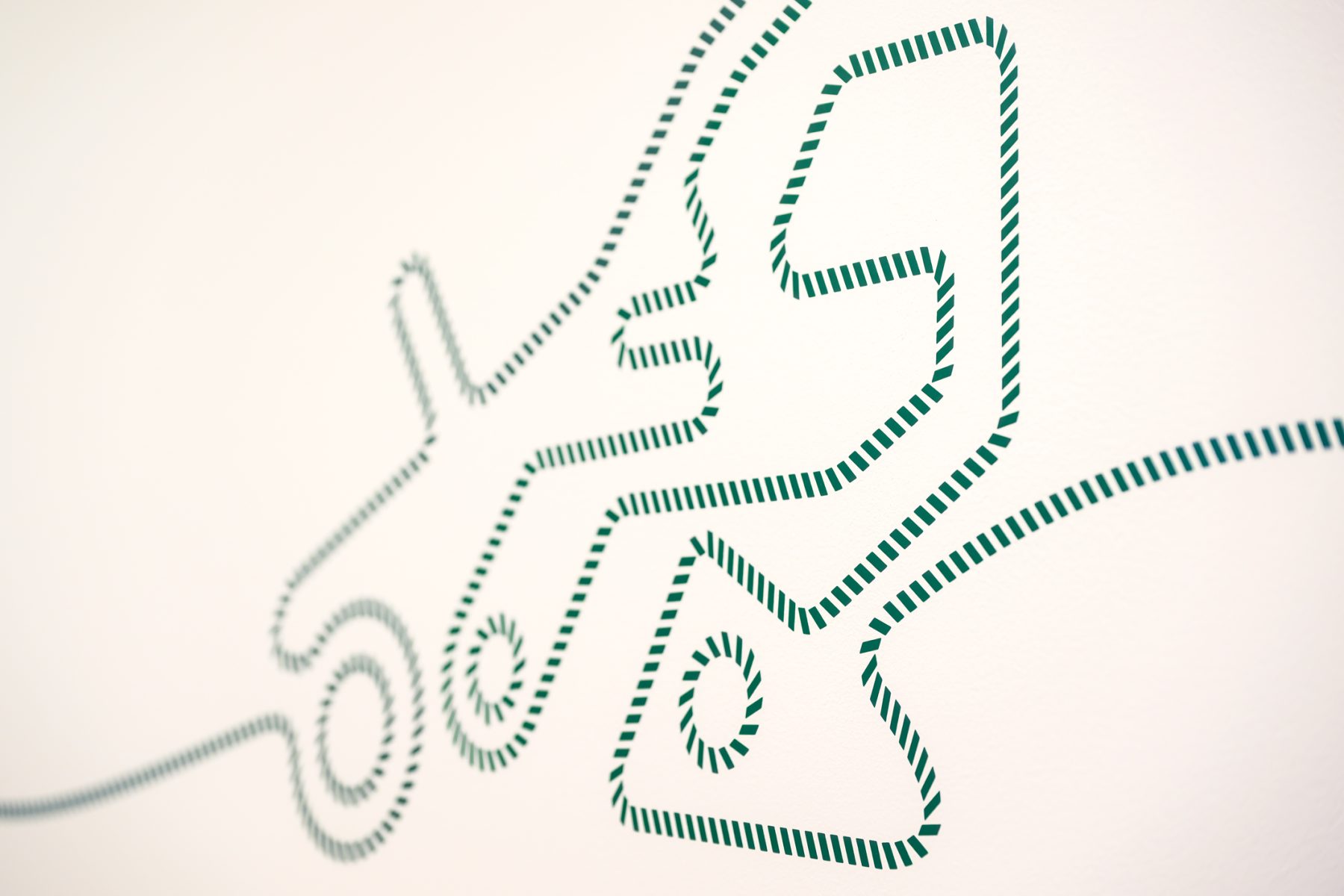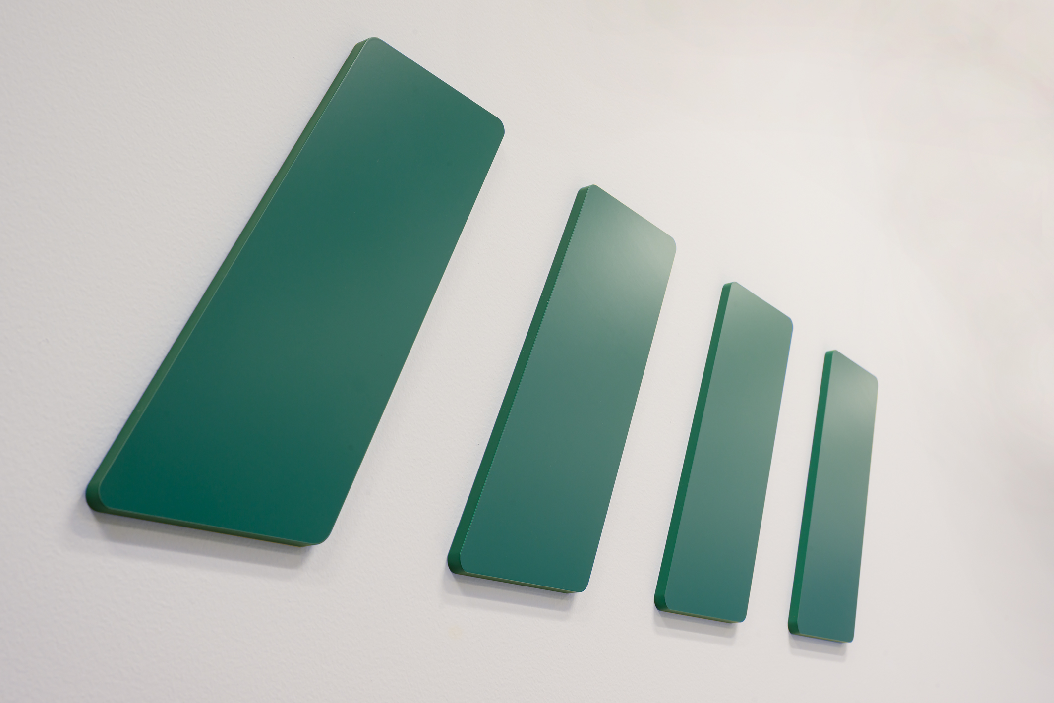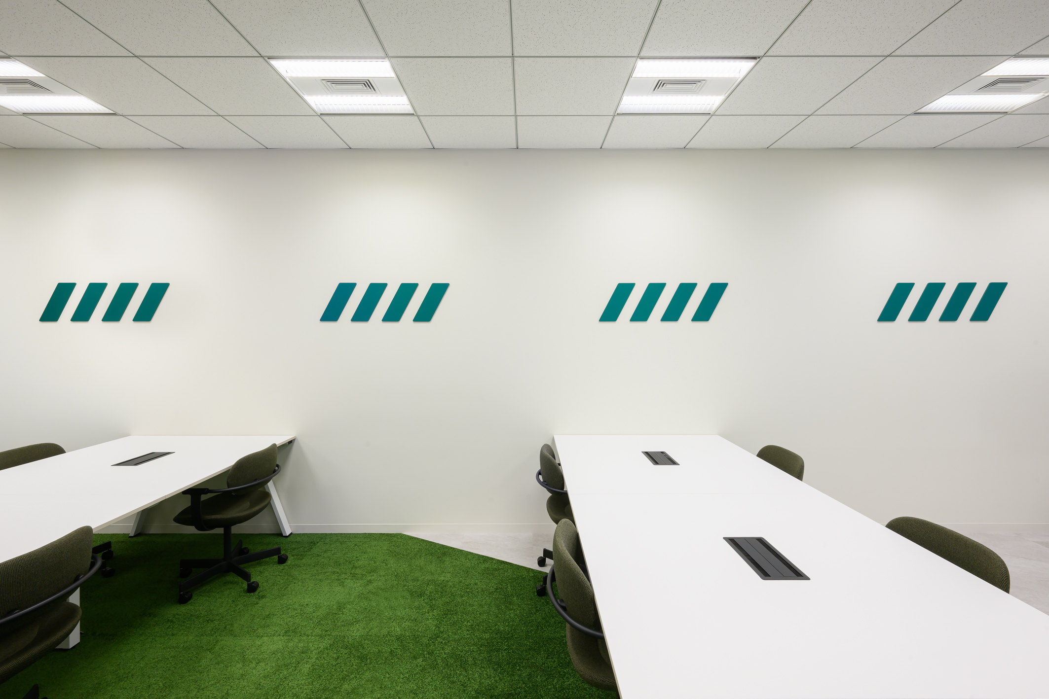 ①象徴的なコーポレートシンボルの「緑の斜線」を、インテリアの主要モチーフとして採用した。 視覚的インパクトの強い床面や壁面のグラフィック、来訪者が直接触れる受付カウンターの天板など、スケールや素材を変えて展開することで、ブランドの存在感と統一感を印象づけた。