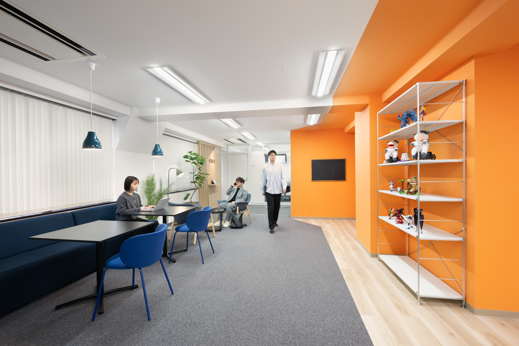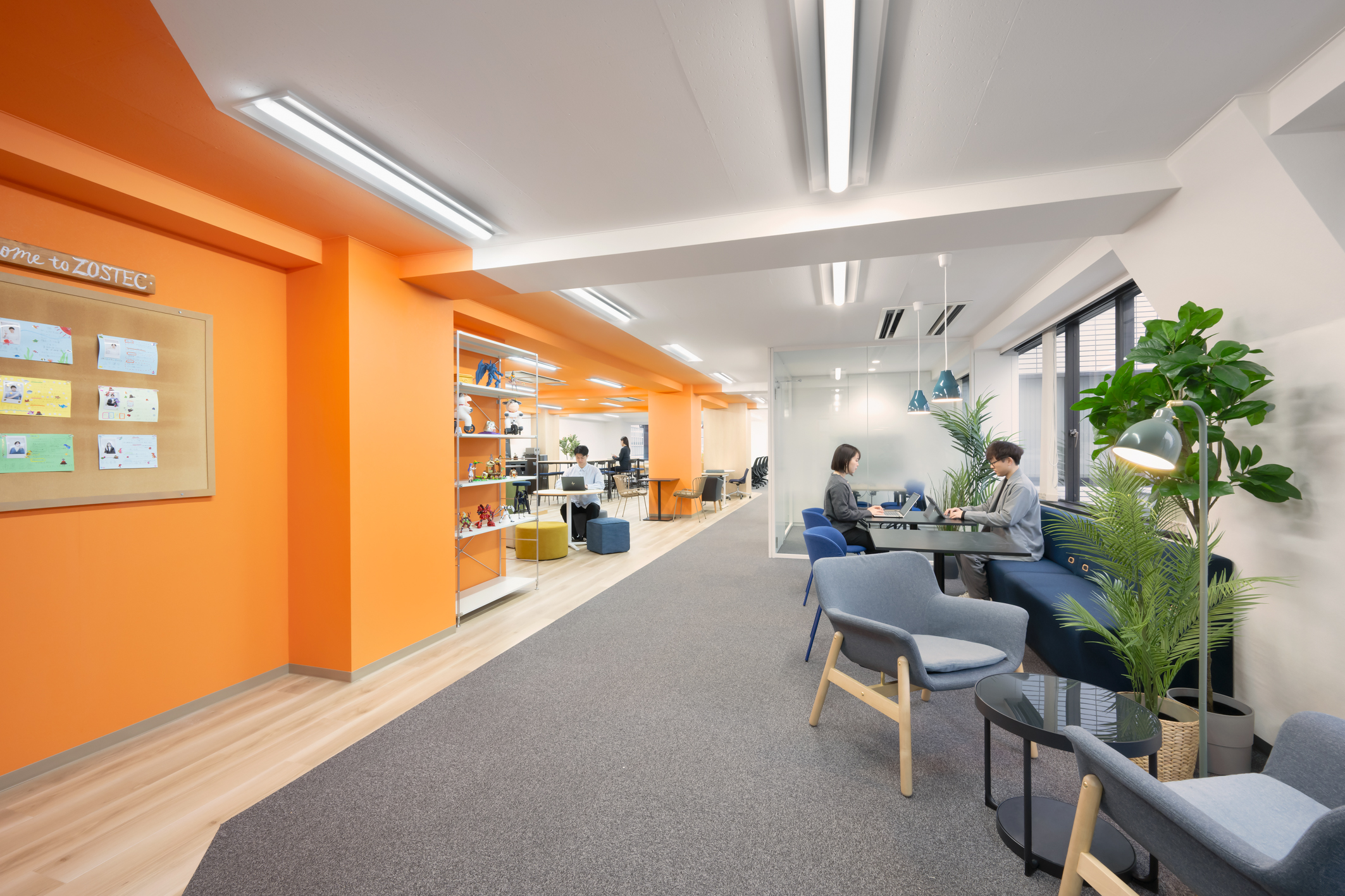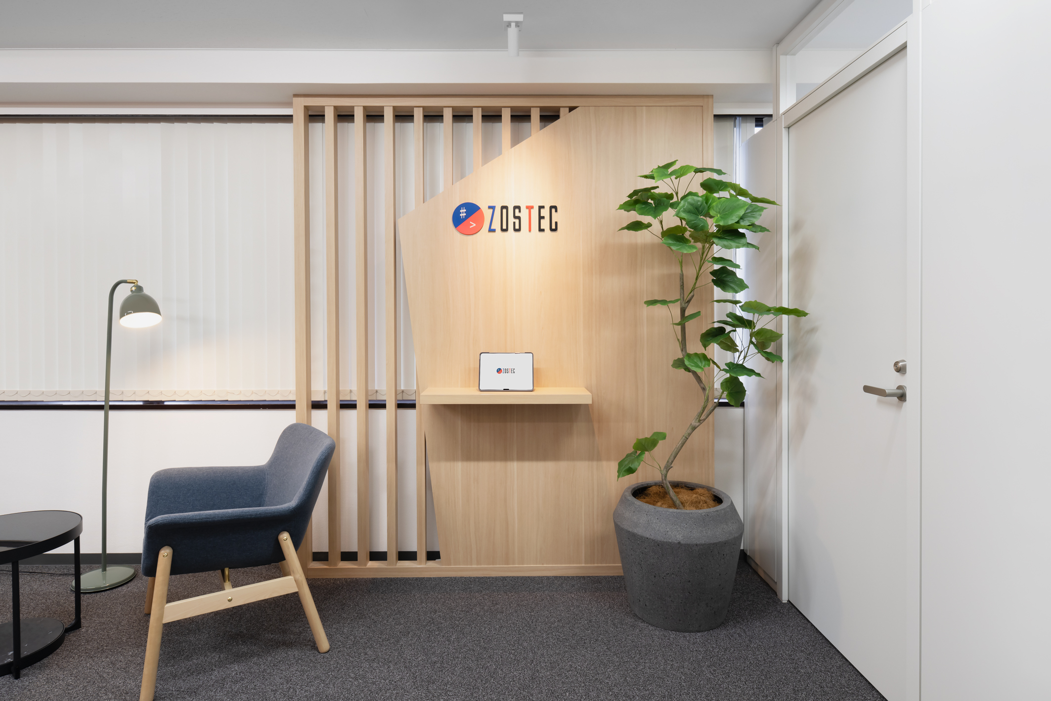 - 来訪者が訪れるエントランスは、木目やコーポレートカラーを取り入れ「ZOSTECらしさ」を表現。