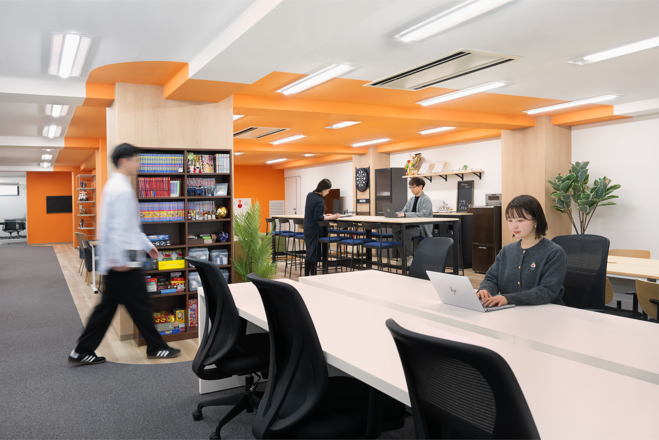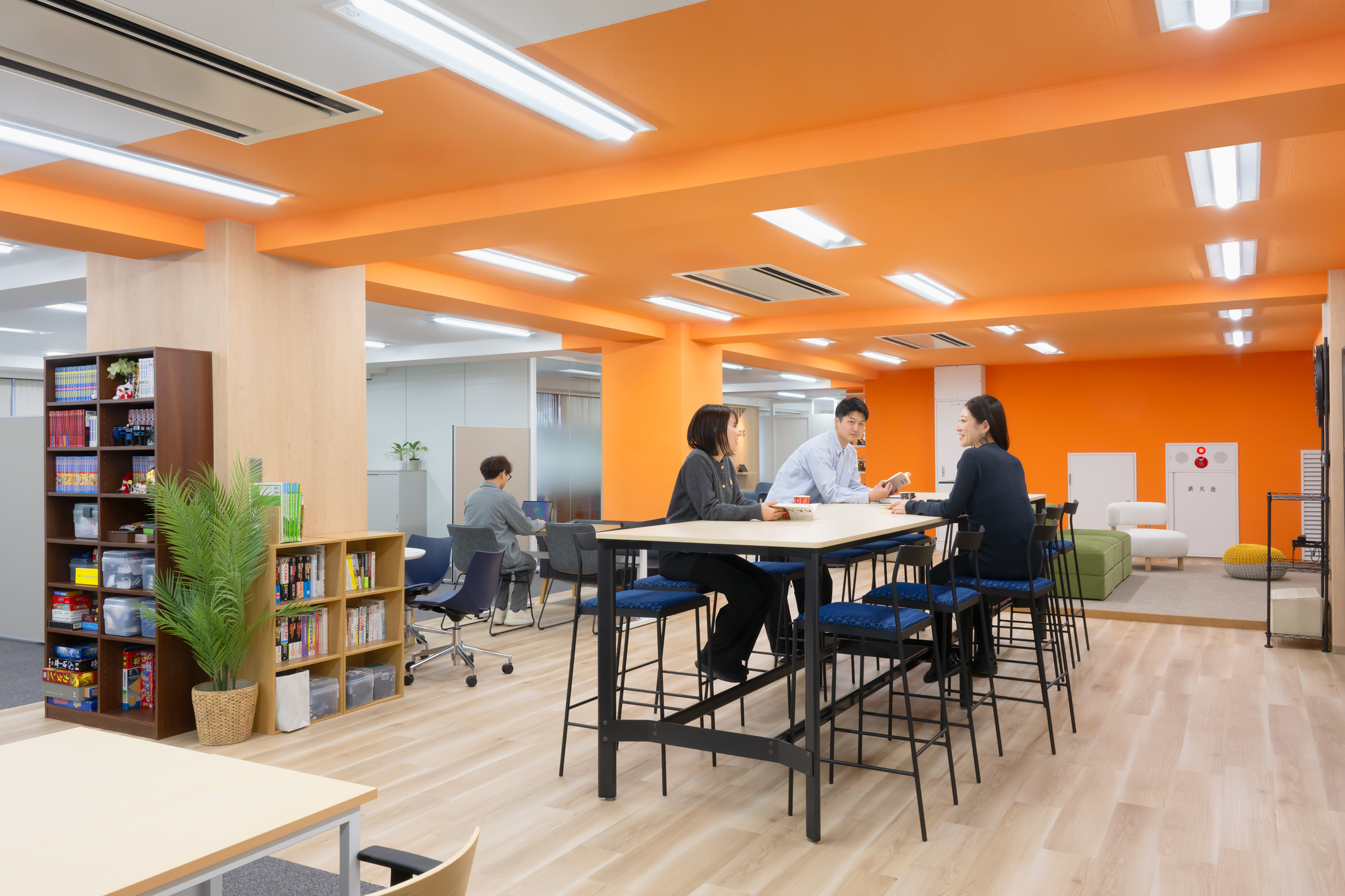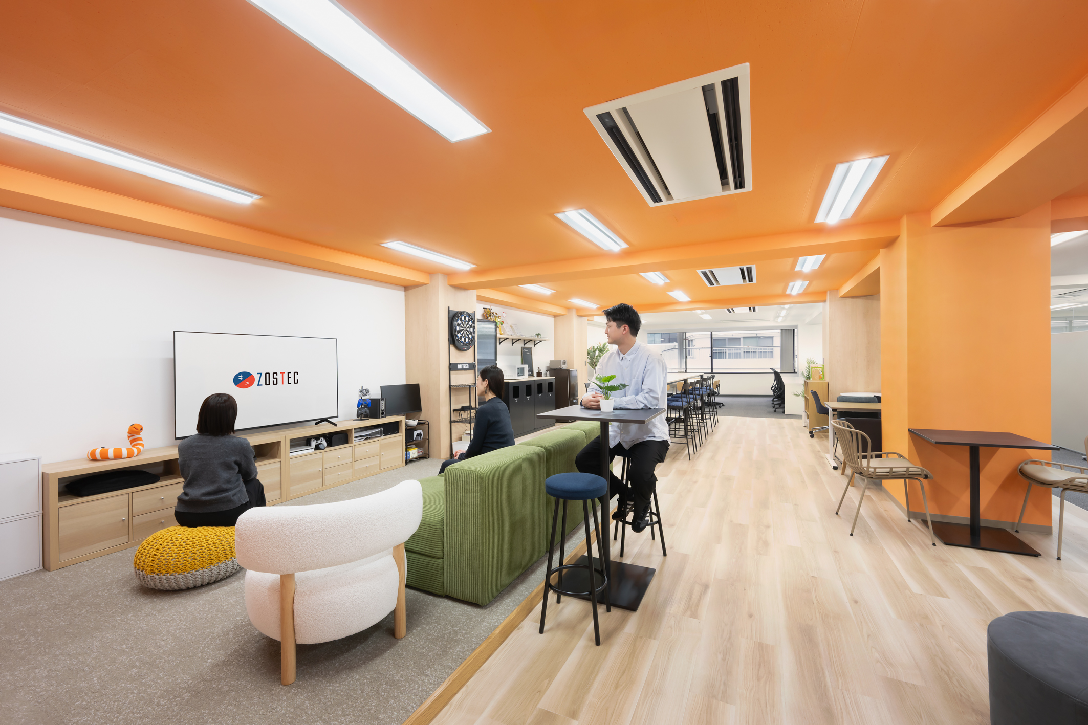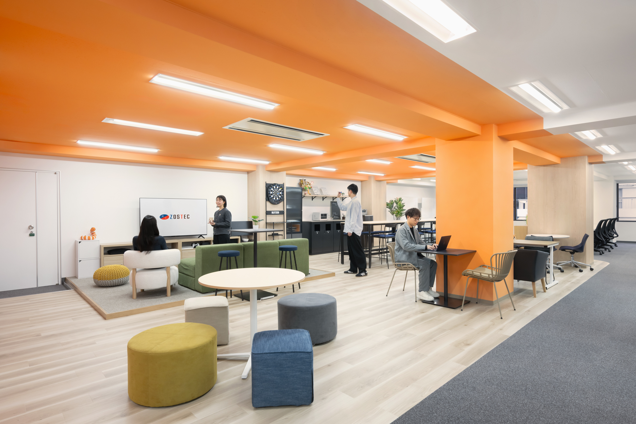 従業員が利用するコミュニケーションエリアを「リビングエリア」とし、明るめのトーンを基調に、リビングを連想させる素材や什器を選定。ZOSTECらしさがより増幅・醸成されるよう、社員間のつながりや交流が活性化される温かみのある空間を構築した。