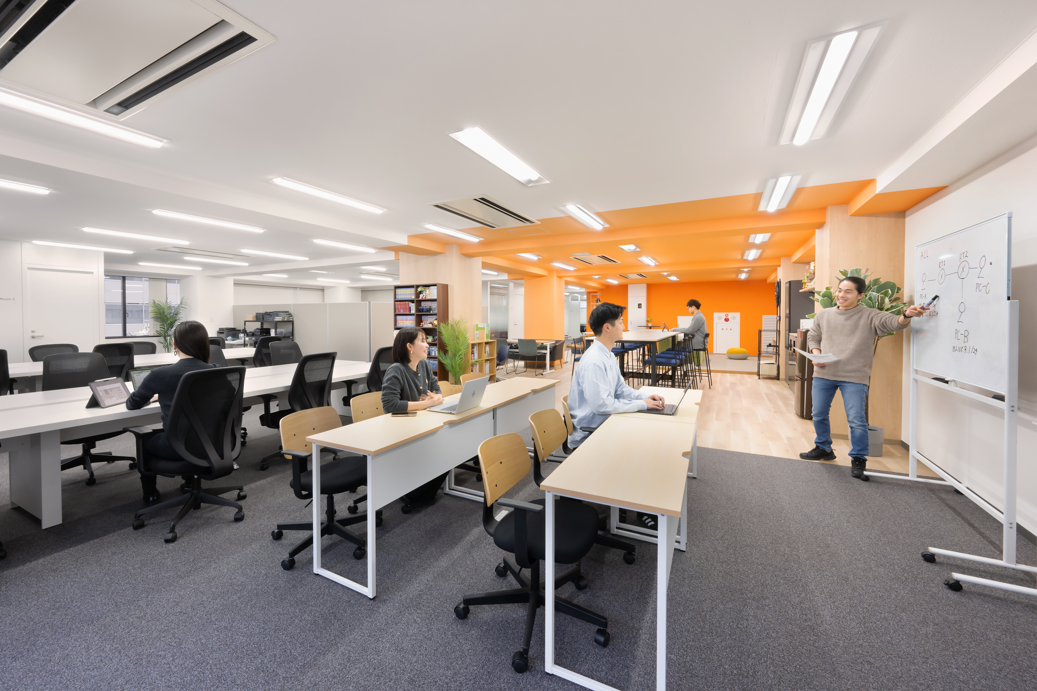 執務室の一部には研修エリアを設け、グループワーク形式やスクール形式など、