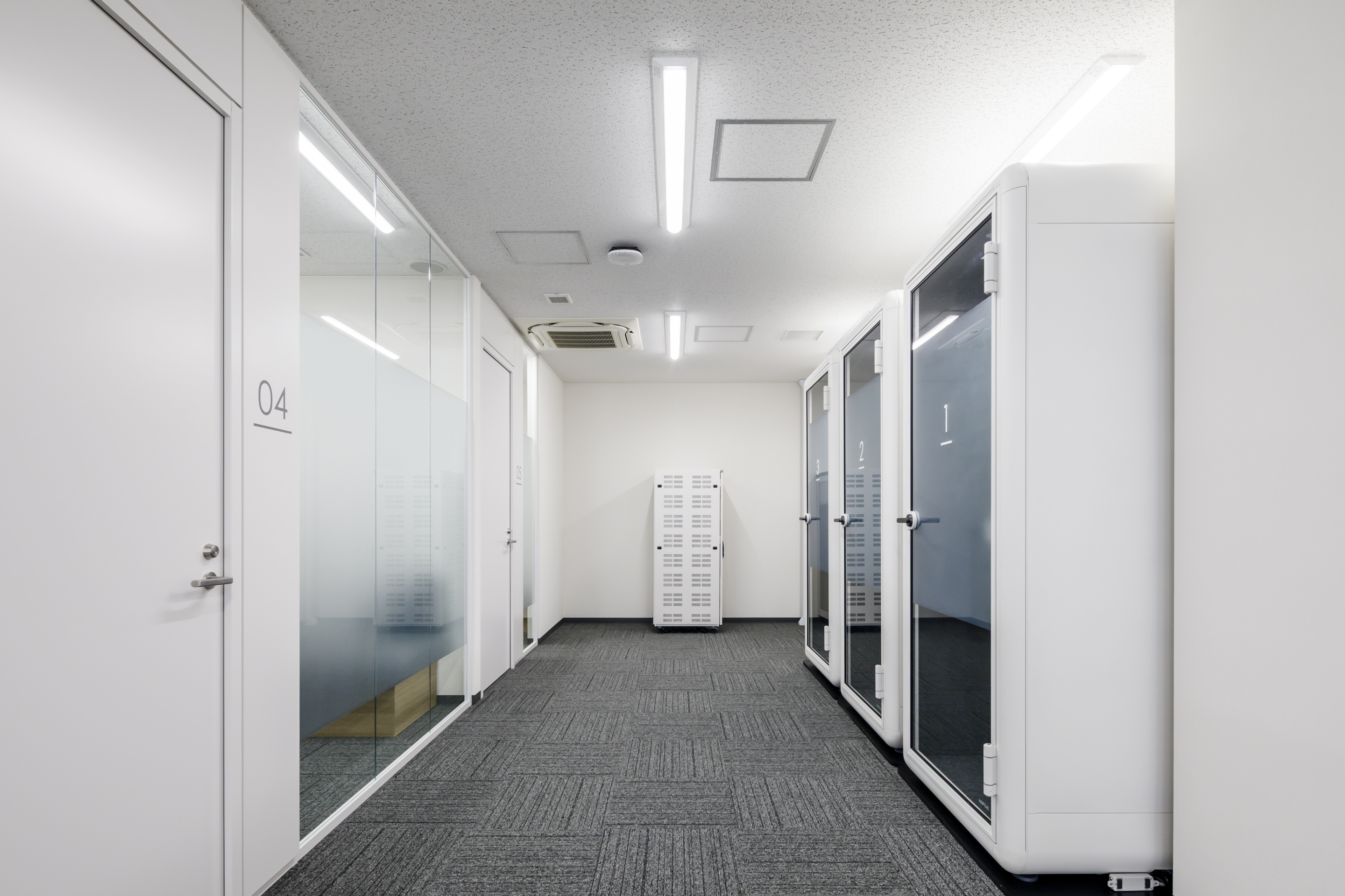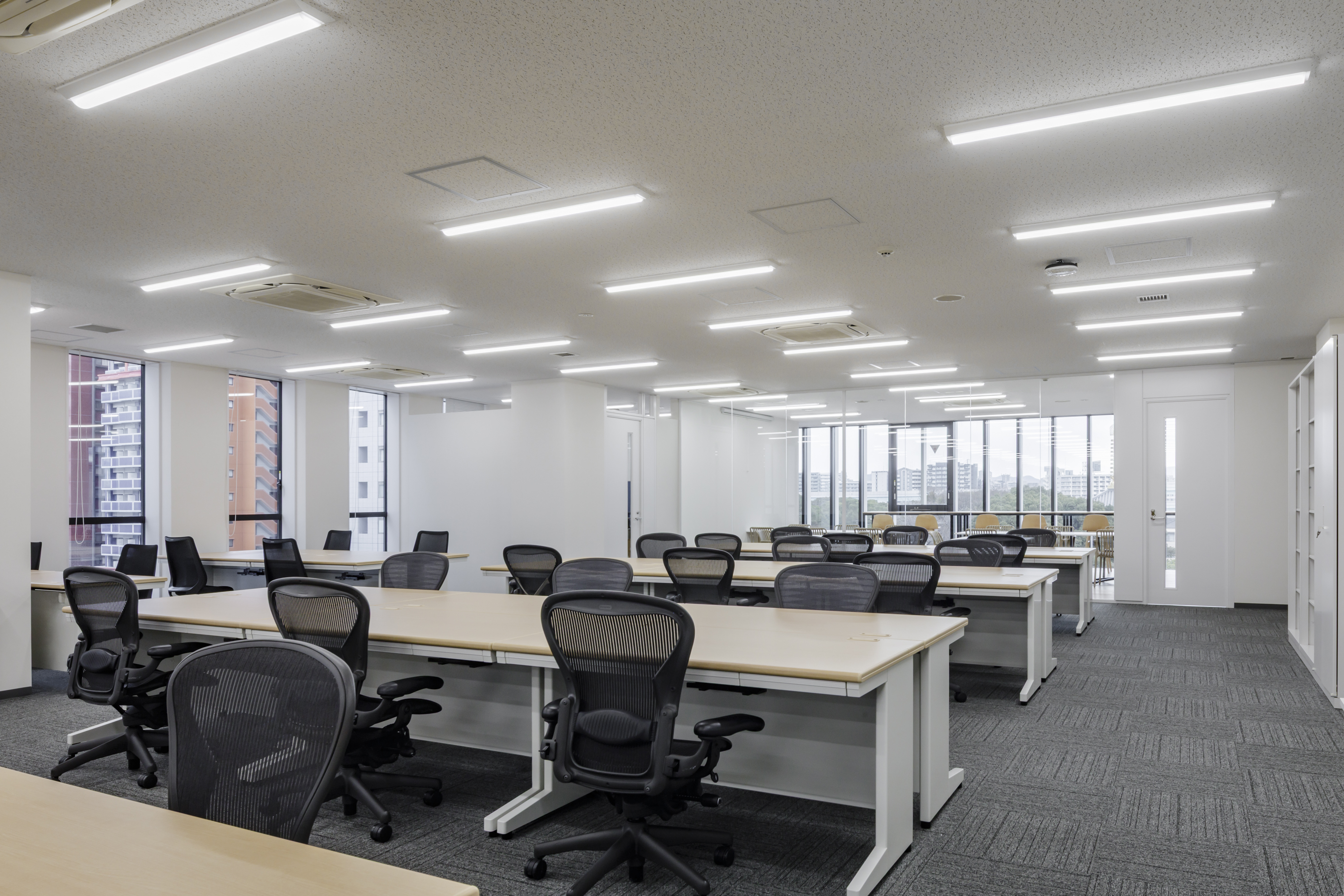 エントランスおよび執務エリアは、企業イメージに合わせて清潔感のある白を基調とした統一感のあるデザインとした。既存拠点で使用されていた什器を転用することを前提に、寸法や特性を踏まえた空間計画とすることで、既存資産を活かしながら機能性を両立させている。席配置のゾーニングにも配慮し、働き方やチームの雰囲気が大きく異なるグループ同士が隣接しないよう計画することで、ストレスの少ない執務環境を実現した。