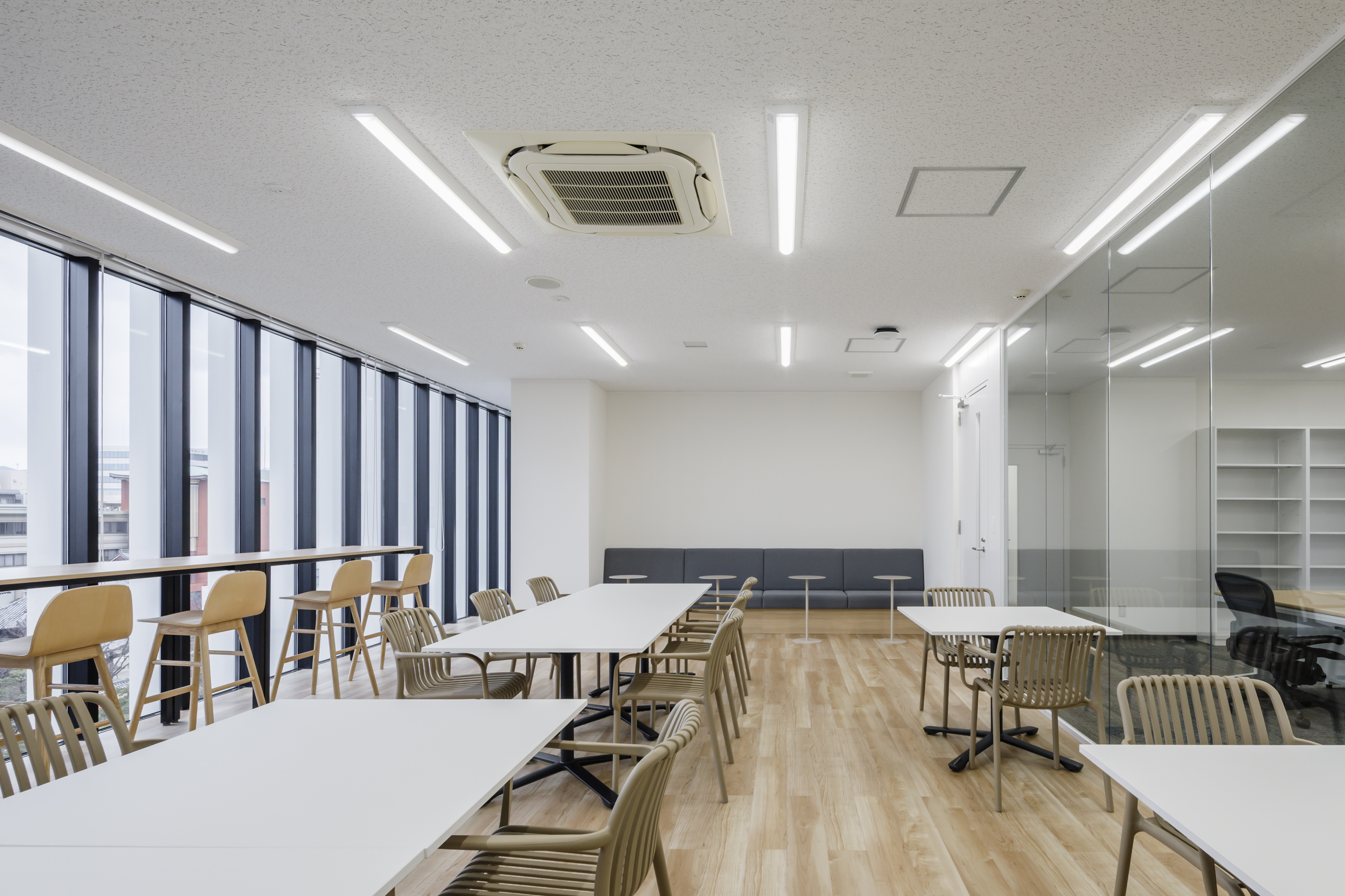 眺望の良いエリアに設けられたリフレッシュスペースは、隣接する寺院の景観を臨みながら、仕事の合間に気分をリセットできる開放的な空間。可動式の什器を採用することでレイアウト変更にも対応しており、セミナーやミーティングなど幅広い用途に活用できるスペースとした。